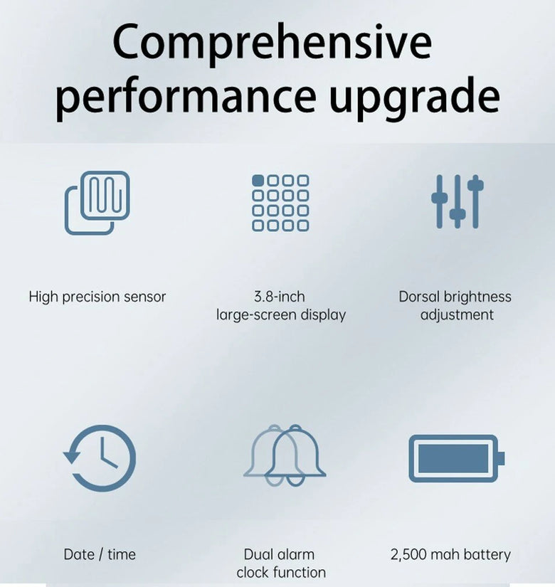 Bright Digital Display: Features a 3.8-inch large digital color display with adjustable brightness, ensuring clear visibility of data. It also includes date and time display and a dual alarm clock function for added convenience.