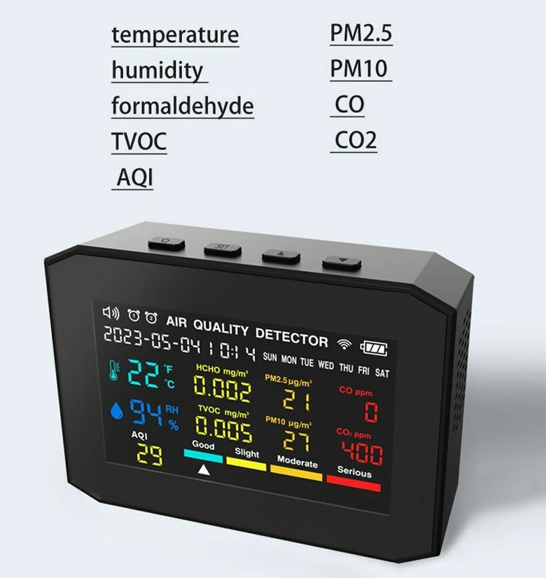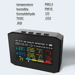 Comprehensive Air Quality Analysis: With the capability to test and display the concentration of PM2.5, PM10, CO, CO2, TVOC, HCHO, AQI, temperature, and humidity simultaneously, this air quality meter ensures a thorough assessment of your environment.