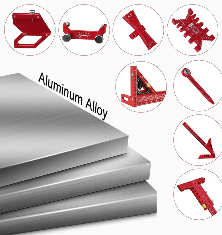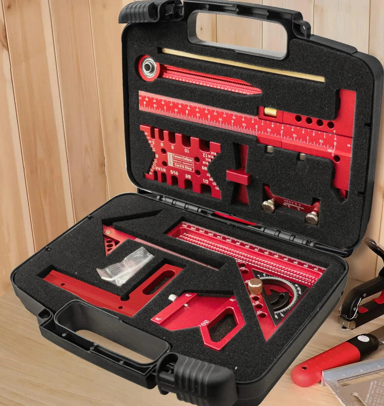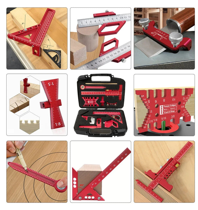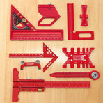 Functionality: 8 multi-functional woodworking rulers/tools + 1 pencil + 1 storage box
