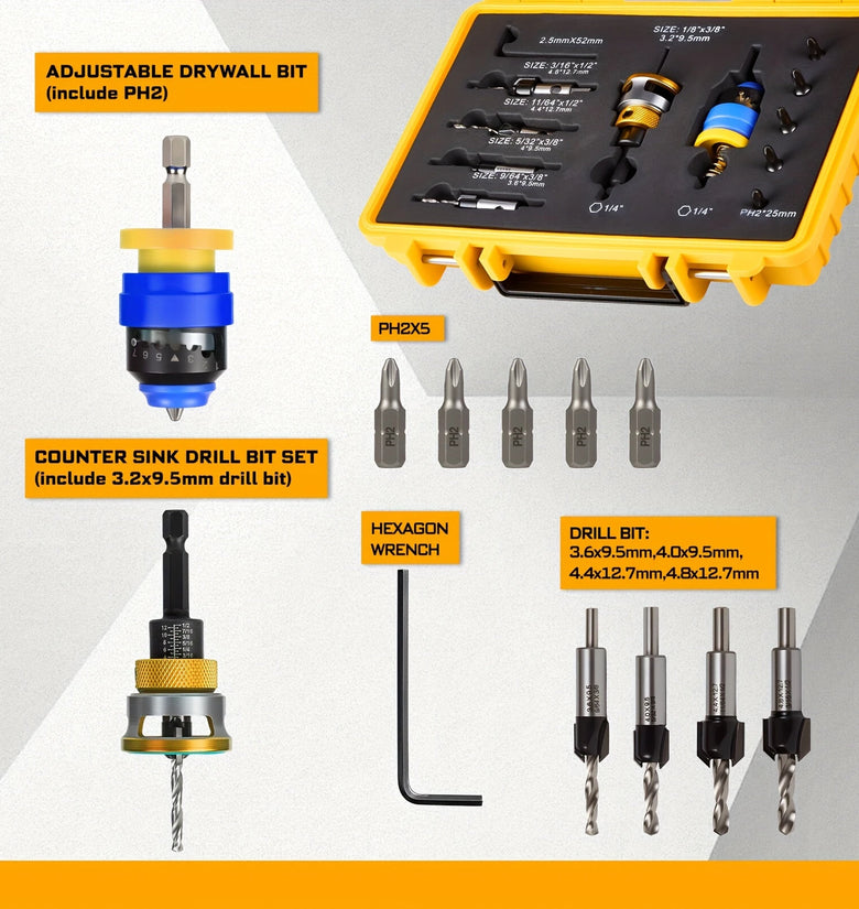 • Adjustable Depth Countersink Drill Bit Set with 5 Tungsten Carbide Drill Bits Hex Shank Professional Woodworking Tools Toolbox Packed for Precise Drilling