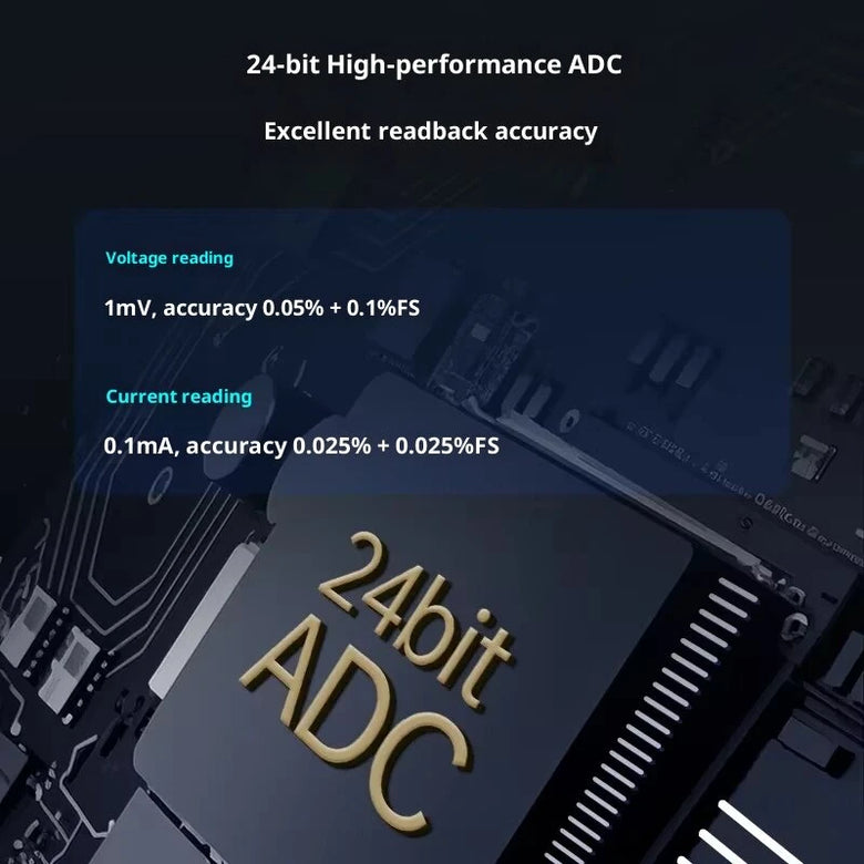 Equipped with a 24-bit high-performance ADC, ensuring highly accurate readings of voltage (1mV resolution) and current (1mA resolution).