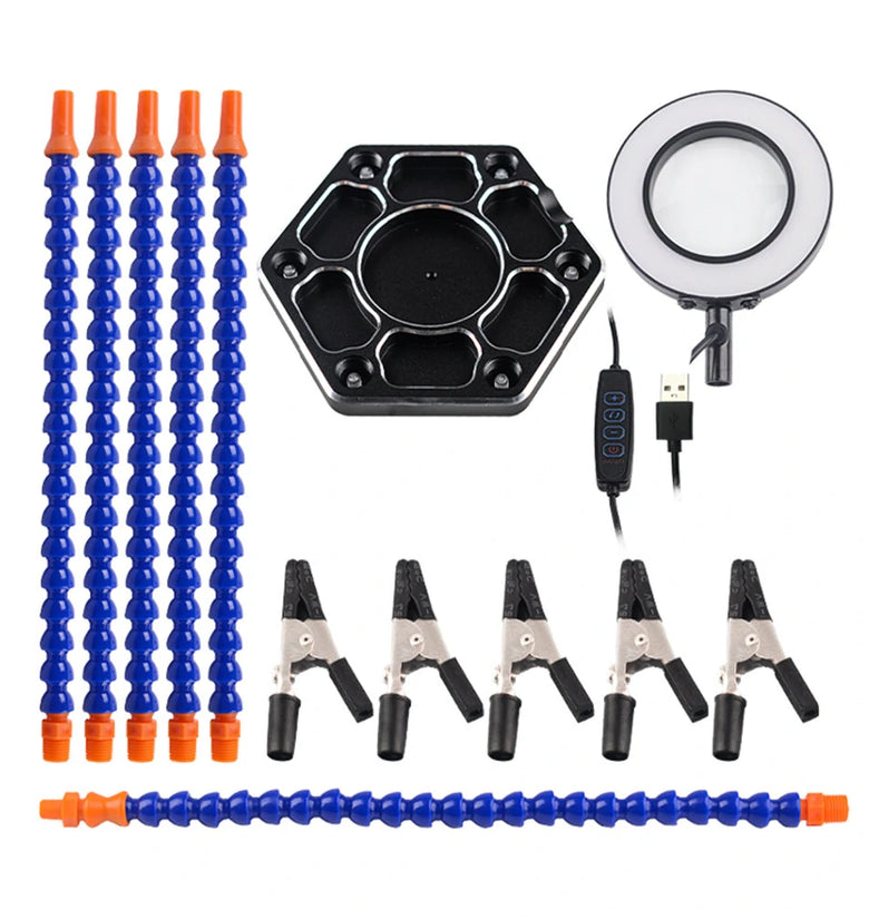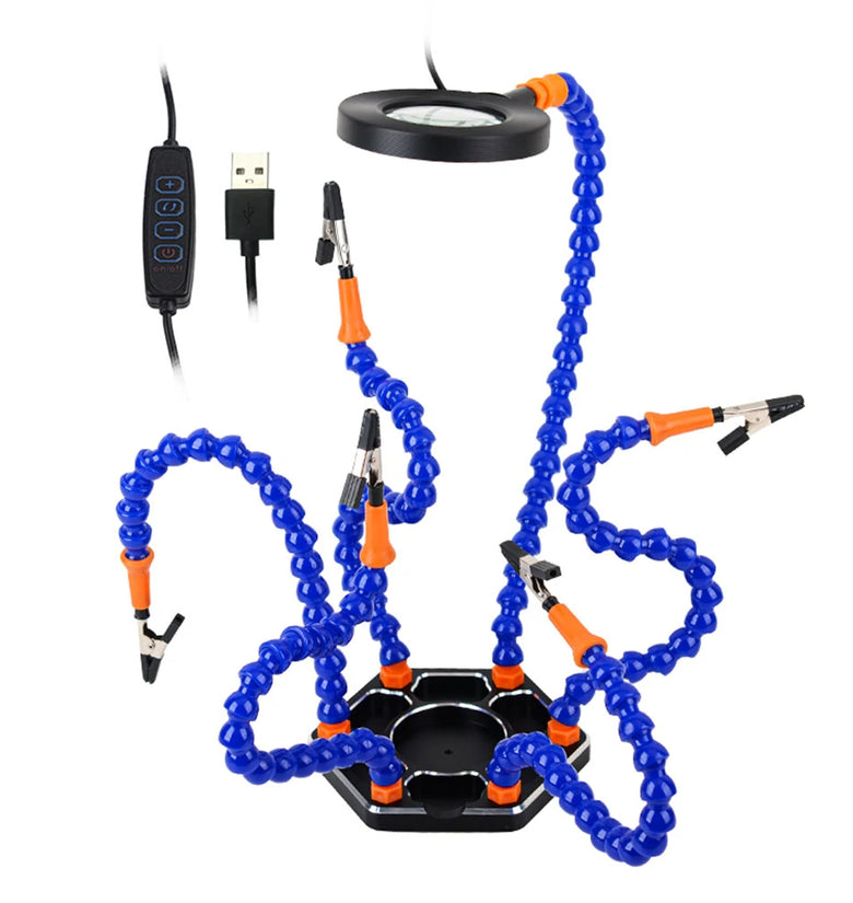 • Aluminum Alloy 6-Claw Soldering Station with USB Magnifying Lamp A High-Powered Solution for Precision Work and Hobbyists.