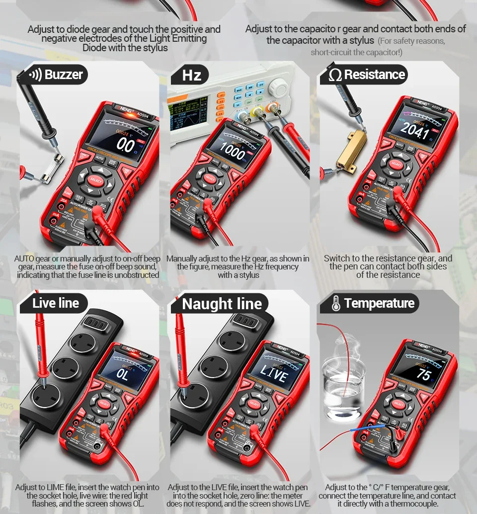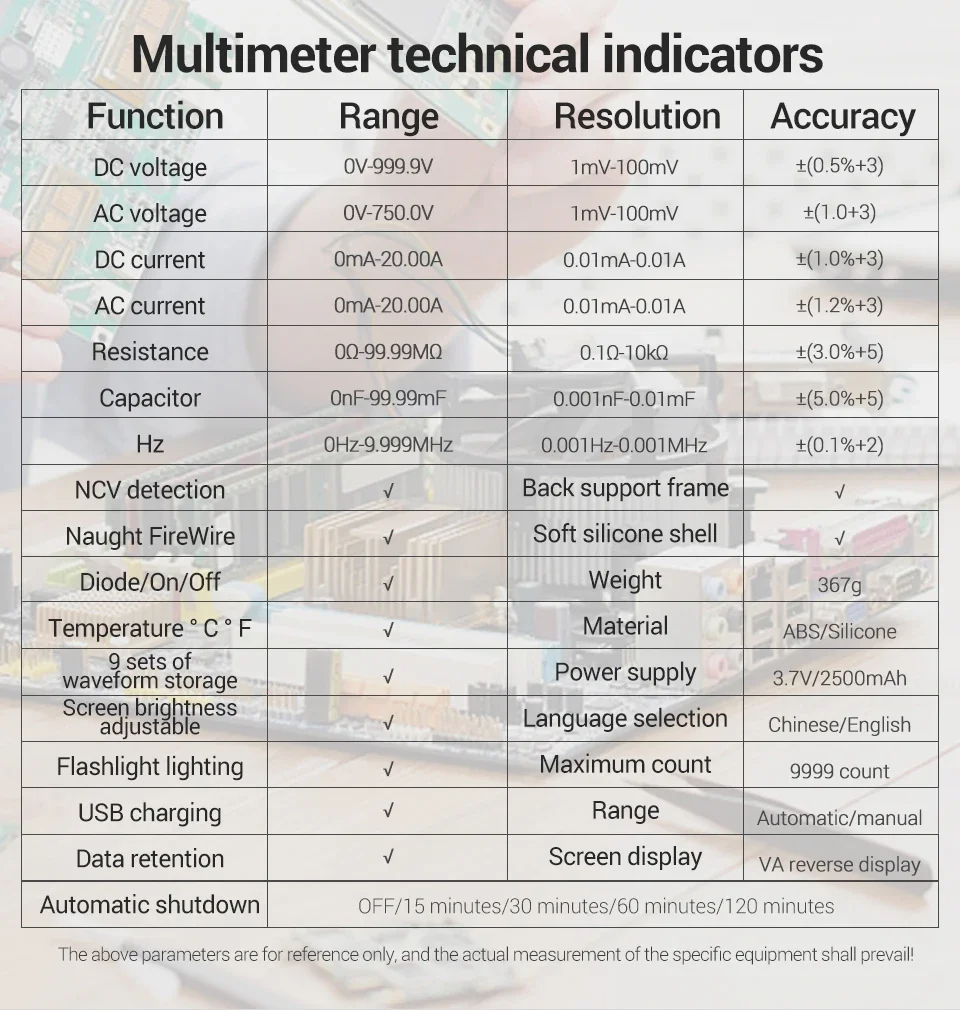 4.Versatile Measurement Range: Supports NCV detection, capacitor testing, frequency measurement up to 9.999MHz, and resistance testing up to 99.99MΩ, meeting diverse testing needs for professionals and hobbyists alike.