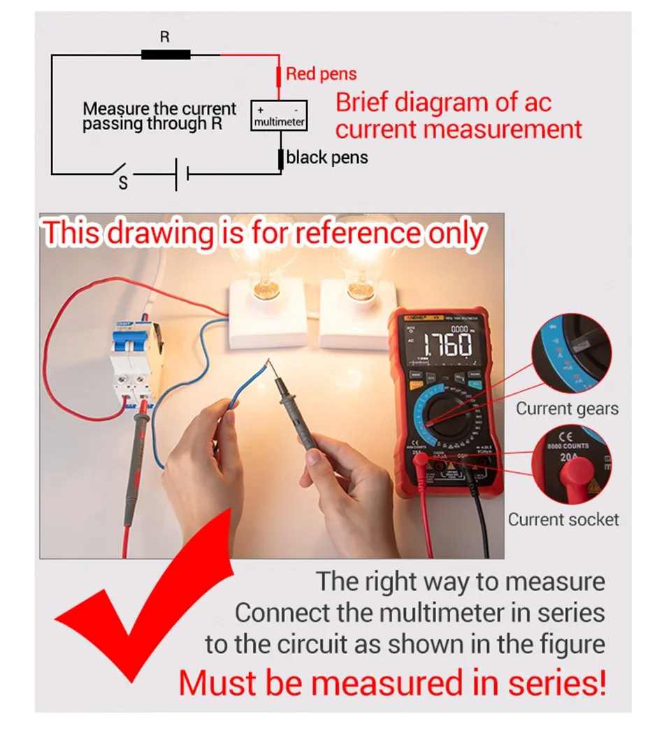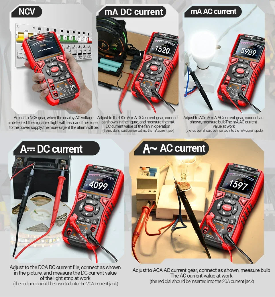 AC Current Range: 0mA-20.00A | Resolution: 0.01mA-0.01A | Accuracy: ±(1.2%+3)