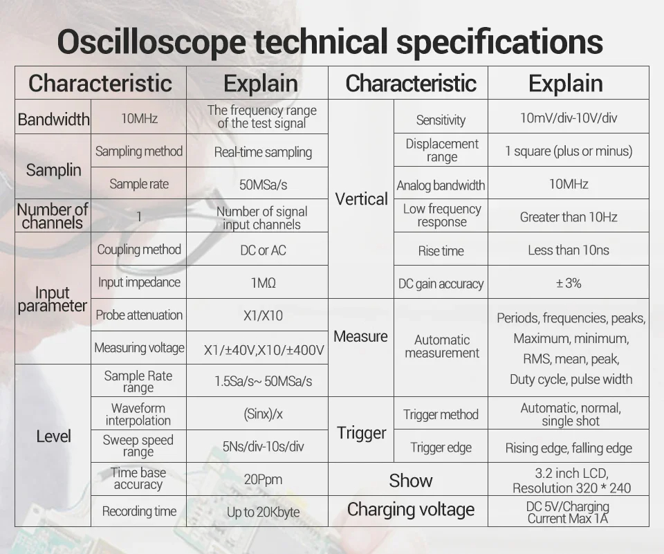 1.High Sampling and Bandwidth: Equipped with a 50MS/s sampling rate and 10MHz bandwidth, this device delivers precise and real-time waveform analysis for accurate measurements across various scenarios.