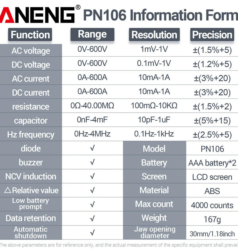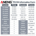 mso-bidi-font-family:'Times New Roman';font-size:10.5000pt;mso-font-kerning:1.0000pt;'>Versatile Clamp Meter: The ANENG PN106 is a 4000-count true RMS clamp meter designed for AC/DC current measurement, voltage measurement, and various electrical testing tasks. It is a reliable tool for electricians and professionals.mso-bidi-font-family:'Times New Roman';font-size:10.5000pt;mso-font-kerning:1.0000pt;'>