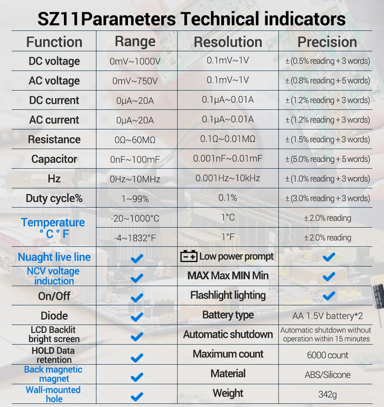 Additional Features: NCV voltage induction, flashlight lighting, LCD backlit screen, magnetic back for hands-free use, wall-mounted hole, low power prompt