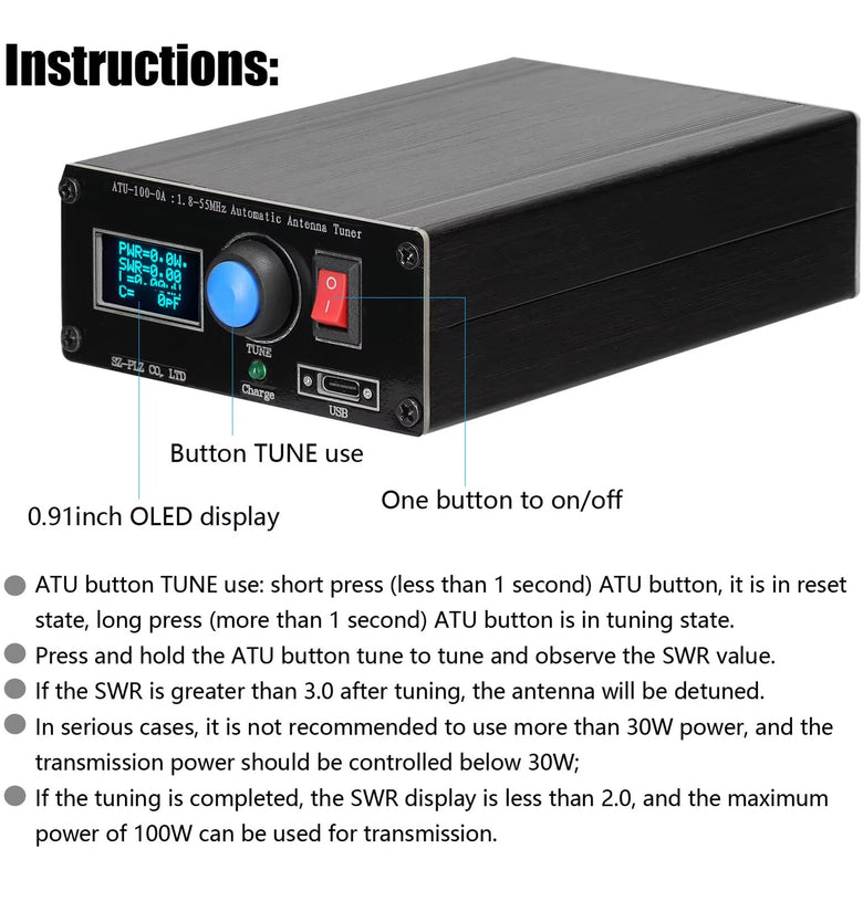 For the first use, please set the output power of the radio or power amplifier between 20-30W, or the high-power tuning can easily damage the antenna tuner.