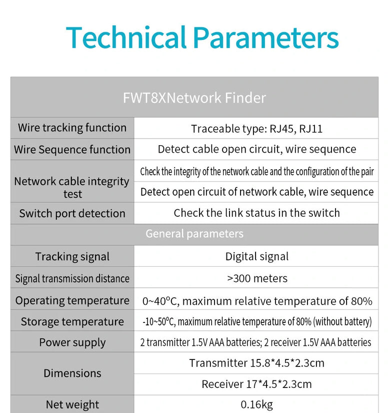 Compact and Lightweight Design: Portability is a important factor in tools like cable trackers. Weighing in at only 0.180 kg and with compact dimensions, the FWT8X is designed to be a comfortable and convenient companion for professionals on the go.mso-bidi-font-family:'Times New Roman';font-size:10.5000pt;mso-font-kerning:1.0000pt;'>