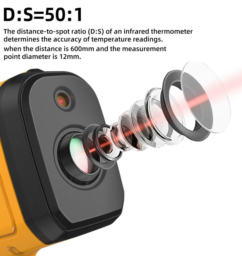 1. When using this product to measure temperature, consider the ratio between the distance (the length from the product to the measured object) and the size of the measurement area, referred to as the object distance ratio. When the distance between the product and the measured object increases, the measurement area will increase accordingly.