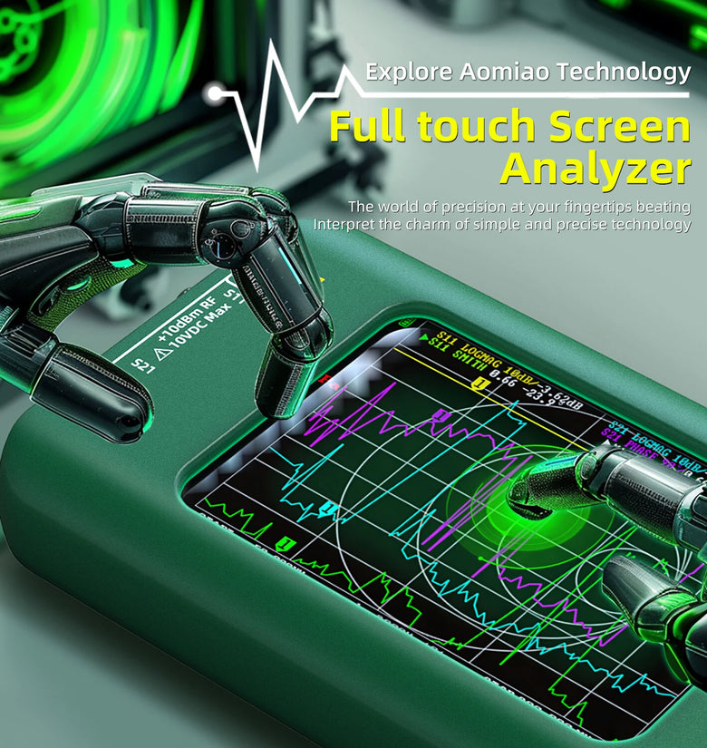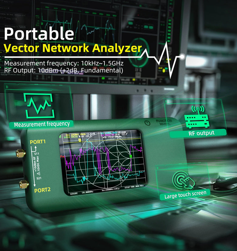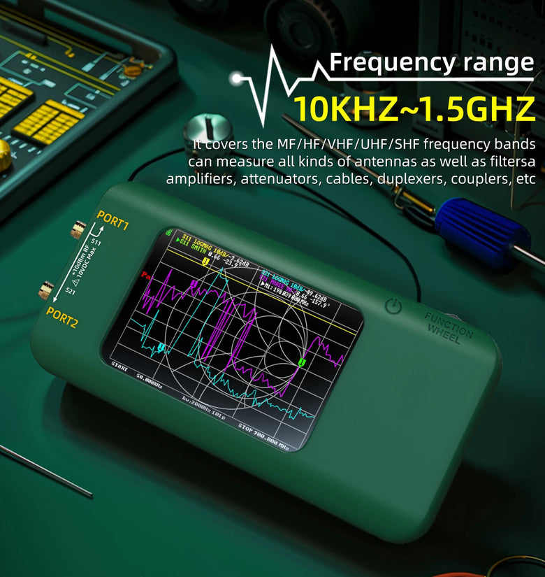 This vector network analyzer features a 3.98-inch TFT full-view angle touchscreen with 320*480 resolution, providing clear and vibrant visuals and responsive touchcontrols. Offers 10 kHz to 1.5 GHz frequency measurement, covering MF, HF, Ultrahigh Frequency, and SHF bands, enabling precise measurements of antennas, filters, amplifiers, attenuators, cables, duplexers, couplers, and other microwave parts. The dual-port configuration supports S11 and S21 parameter measurements and sophisticated measurement capabilities, including TDR and DTF through IFFT calculations.