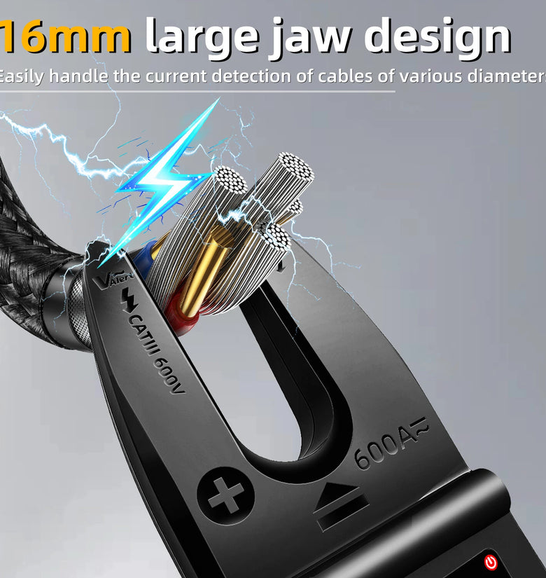 2. Innovative U-Shaped Clamp Design: The large 16mm jaw accommodates a variety of cable sizes, making current measurement in tight spaces straightforward and efficient.