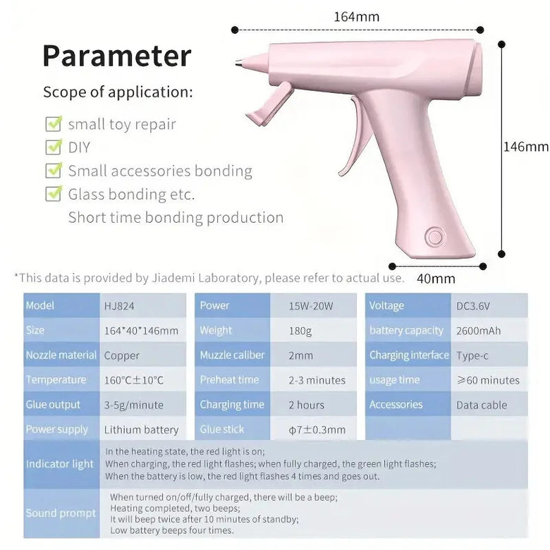 • Cordless Hot Glue Gun HJ824 2600mAh Rechargeable Battery USB-C Fast Preheating Auto Shut-Off Includes 10 Premium Glue Sticks for Wood Craft Repairs