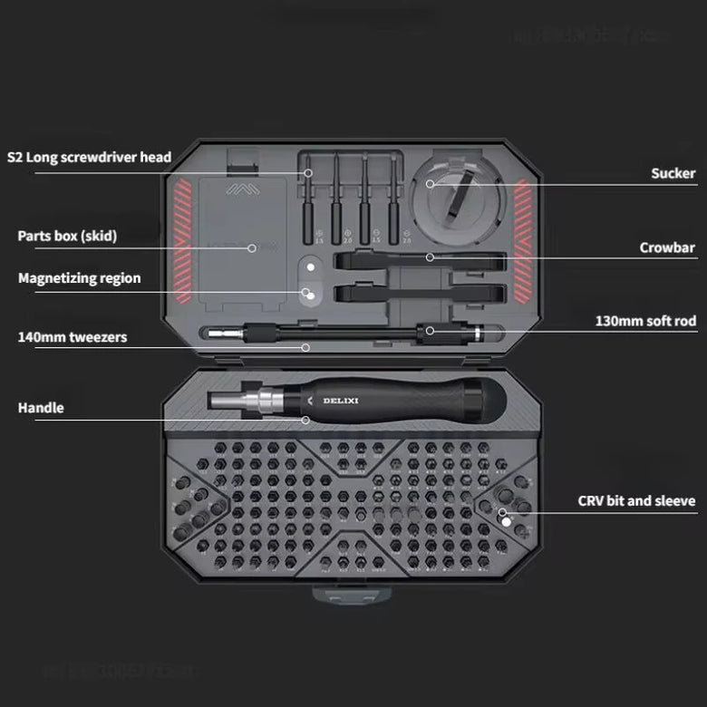 Comprehensive 145-in-1 Screwdriver Set: This all-inclusive kit features 145 pieces, making it incredibly versatile for various repair and DIY tasks. With 132 precision screwdriver bits, it is suitable for mobile phone repair, electronics, and home DIY projects. This extensive assortment ensures you have the right bit for any job.Precision and Magnetic Tips: The screwdriver bits are magnetically tipped, making it easier to handle small screws and preventing potential loss during repairs. Precision machined, these bits ensure a perfect fit for screws, reducing the likelihood of stripping or damaging them. This feature enhances your efficiency and accuracy in delicate tasks.High-Quality Disassembly Accessories: The kit includes 13 essential disassembly tools, such as starting rods, tweezers, and a soft extension rod. These accessories aid in the safe and efficient dismantling of your devices, ensuring you can access tricky spots and delicate components without damaging them.Ergonomic and Easy-to-Use Design: Equipped with an ergonomic handle and soft extension rod, this screwdriver set offers enhanced control and comfort. The handle is designed to fit comfortably in hand, reducing strain during prolonged use. The soft extension rod provides flexibility, allowing you to work in tight and awkward spaces easily.Portable and Organized Storage: All pieces come organized in a compact, portable storage case, making it easy to keep your tools in order and transport them wherever you need to go. This thoughtful organization ensures that each tool is quickly accessible, saving time and reducing frustration during repairs.Specifications:Product Name: DELIXI 145 in 1 Screwdriver SetTotal Pieces: 145Screwdriver Bits: 132 piecesDisassembly Accessories: 13 piecesDisassembly Accessories Include:2 x Starting Rod1 x Sucker5 x Tweezers1 x Soft Extension Rod1 x HandleBits Material: Precision, magnetically tippedHandle Material: Ergonomic designStorage Case: Compact and portablePackage Included:132 x Screwdriver Bits2 x Starting Rods1 x Sucker5 x Tweezers1 x Soft Extension Rod1 x Handle1 x Storage CaseNotes:Keep the storage case in a dry place to prevent any possible rust or corrosion. Always use the correct bit size for your specific screw type to maintain optimal performance. Ensure all tools are returned to the case after use for easy organization and transport.Detail Pictures: