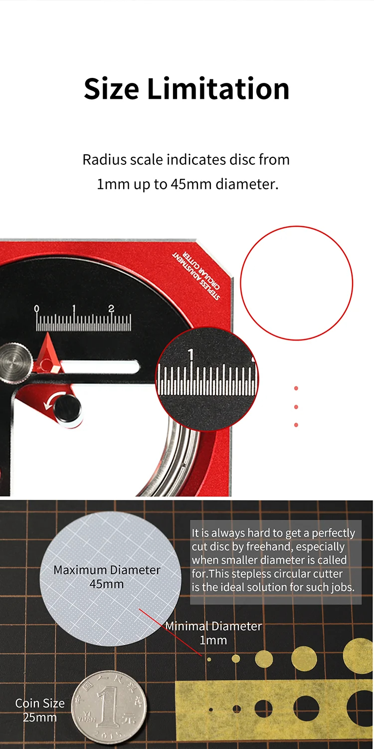 1.Precise Stepless Adjustment: Supports a wide range of sizes (1–45mm), enabling highly accurate circular cutting for hobbyists, model makers, and craft enthusiasts.