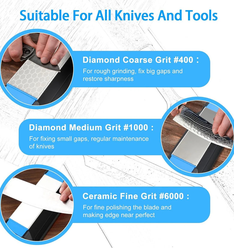1. Three-Side Grit Design: This sharpening stone features three different grits (400/1000/6000) to accommodate various needs, from repairing large gaps to achieving razor-sharp finishes. The 400# grit is designed for repairing any damage or restoring basic sharpness, the 1000# is for regular maintenance and honing, while the 6000# is perfect for fine polishing and achieving ultra-sharp edges.