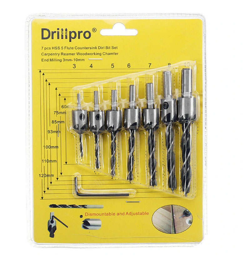 • Drillpro 7pcs HSS 5 Flute Countersink Drill Bit Set Reamer Woodworking 3-10mm Chamfer Drill Bits
