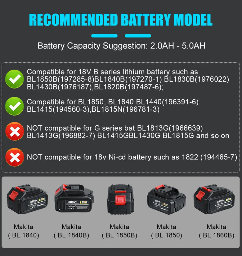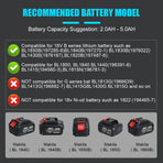 √ compatible for 18V B series lithium battery,such as BL1850B(197285-8),BL1840B(197270-1),BL1830B(197602-2),BL1430B(197618-7),BL1820B(197487-6);