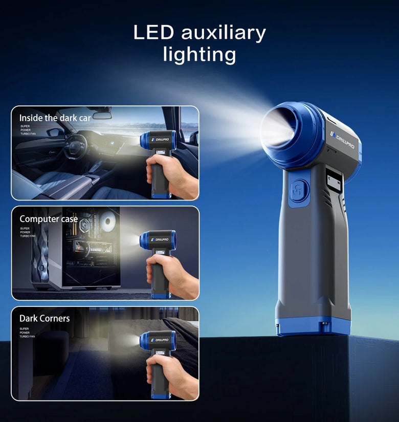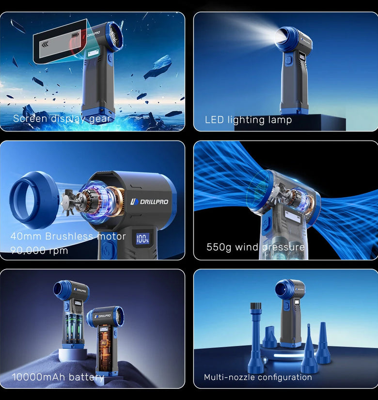 • Drillpro G1 Cordless 550g Wind Pressure Turbo Fan 10,000mAh Battery 9 Speed Settings 90,000RPM Brushless Motor Powerful Handheld Air Blower Multi Nozzle