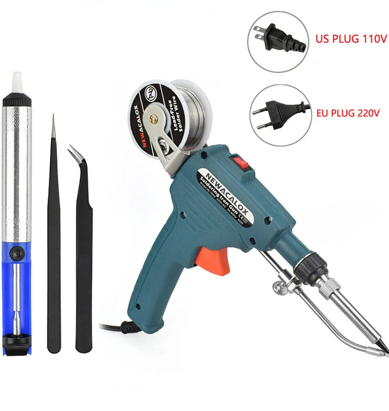 1 x Soldering Tin Gun (Plug type and color as your choice)1 x Suction Tin Device1 x Solder Wire1 x Mini Phillips Screwdriver2 x Tweezers(fine tip curved,fine tip straight)