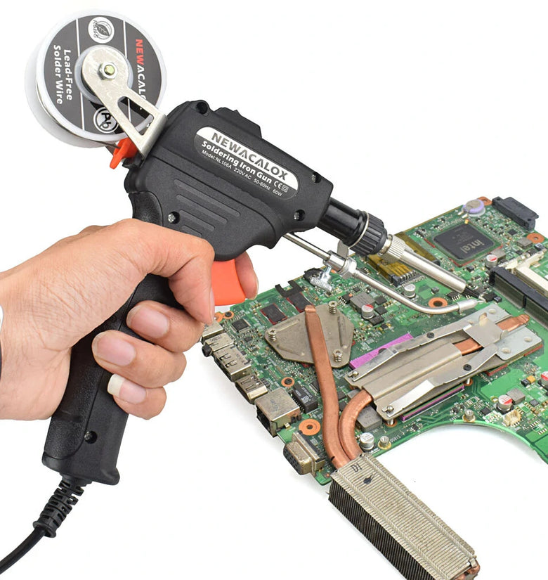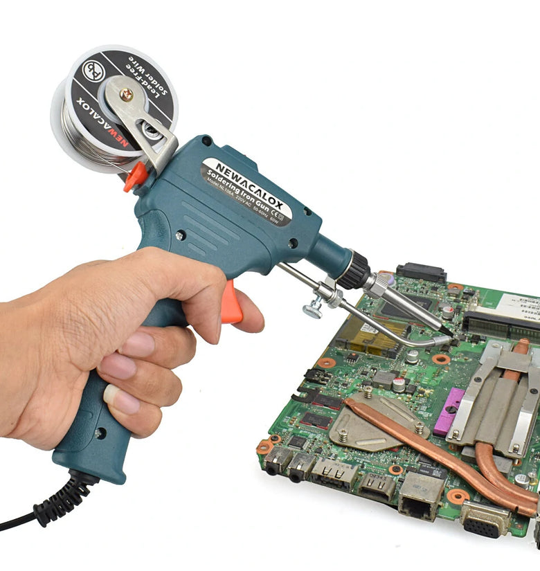 Specification:Material:Alloy Tip + ABS Strong PlasticWorking Temperature: 430 degrees CelsiusPower: 60WOptional Voltage: EU plug 220V, US plug 110V , 50-60 HZOptional Color:Red/Black/GreenRated with a diameter of 0.8-1.2mm tin line.Soldering Iron Tip:900M SeriesHeating Core Material:PTC Imported Ceramic Heating CoreWarm-up time: 2-4 minutesFeature:1. The internal heating automatically sending tin gun to prevent high temperature burns during operation.2. 900M series soldering iron head, natural mica material heating core, fast heating, durable, long life, replaceable, assembled and disassembled.3. The side door design makes it easy to view internal operations and replace the heating core. Scientific design, not easy to get stuck!4. can be operated with one hand, check the work situation at any time, efficient and convenient.5. With power switch, energy saving and safety. The tin wire scaffold is detachable and easy to use.6. High-quality ABS plastic case, comfortable to hold, power cord is soft, curved and more durable.