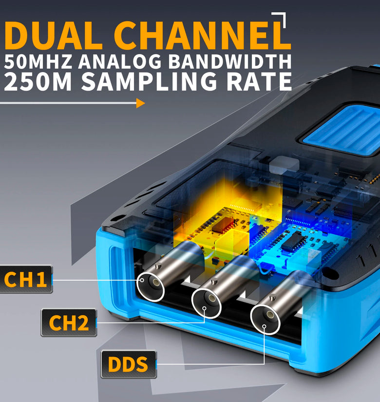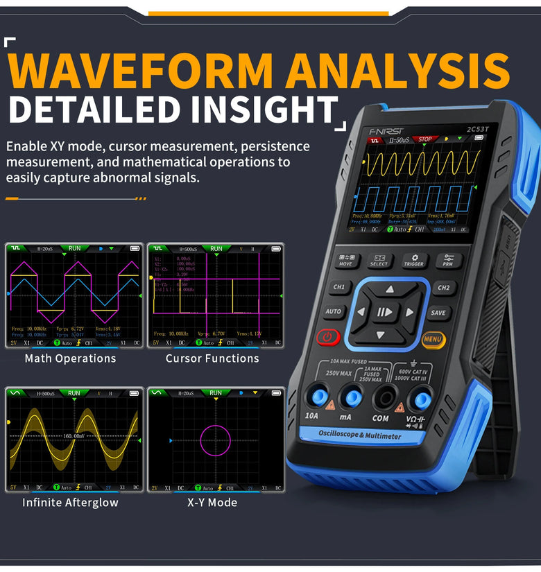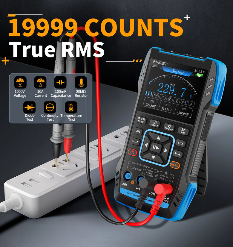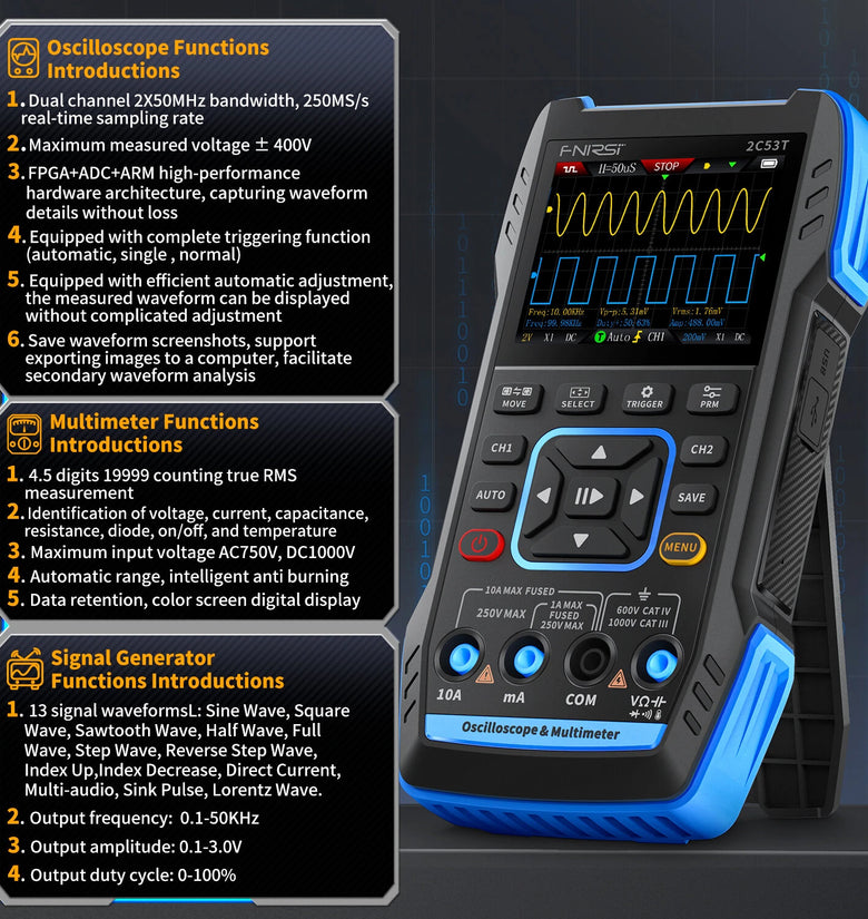 FNIRSI-2C53T is a versatile and highly practical 3 In 1 dual-channel 50MHZ digital oscilloscope launched by FNIRSI, designed for professionals in the maintenance and research industries. This device combines the functionalities of an oscilloscope, a multimeter, and a signal generator. The oscilloscope uses FPGA+ARM+ADC hardware architecture, featuring a 250MS/s sampling rate, a 50MHz analog bandwidth, and an integrated high-voltage protection module that supports peak voltage measurements up to ±400V. It also supports waveform screenshot saving and viewing for secondary analysis.The multimeter function offers 4.5 digits with 19999 counts true RMS, supporting AC/DC voltage and current measurements, as well as capacitance, resistance, diode, and continuity measurements, making it an ideal multifunctional instrument for professionals, factories, schools, enthusiasts, or home use.The built-in DDS function signal generator can output 13 types of function signals, with a maximum output frequency of 50KHz and a step size of 1Hz. The output frequency, amplitude, and duty cycle are adjustable. It features a 2.8-inch 320*240 resolution high-definition LCD screen and a built-in 3000mAh rechargeable lithium battery with a standby time of up to 6 hours. Its compact size provides users with more powerful practical functions and excellent portability.Key Features:1. Anti-burning: Dual ceramic fuse protective circuit. Intelligent anti-burn with overload protection, and built-in double fuse making it safer Excellent performance: The hardware architecture adopts the same ARM+FPGA+high-speed ADC scheme as desktop computers, with high cost. it is not an ordinary CPU direct acquisition scheme, and has a powerful triggering system with super strong waveform capture ability, without losing waveform details.