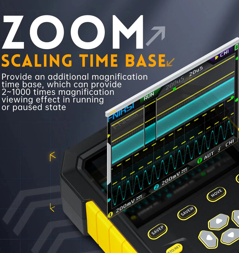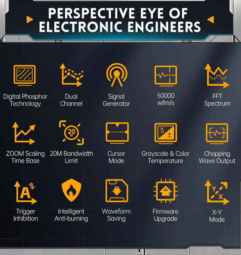 Customization and User Support: With a mechanical keypad for easy navigation, the oscilloscope provides a user-centric experience. The device has a digital trigger mode and supports various standard function signals. If you meet any doubts during operations, the system's help function will guide you through.