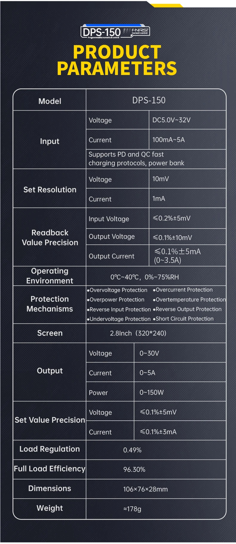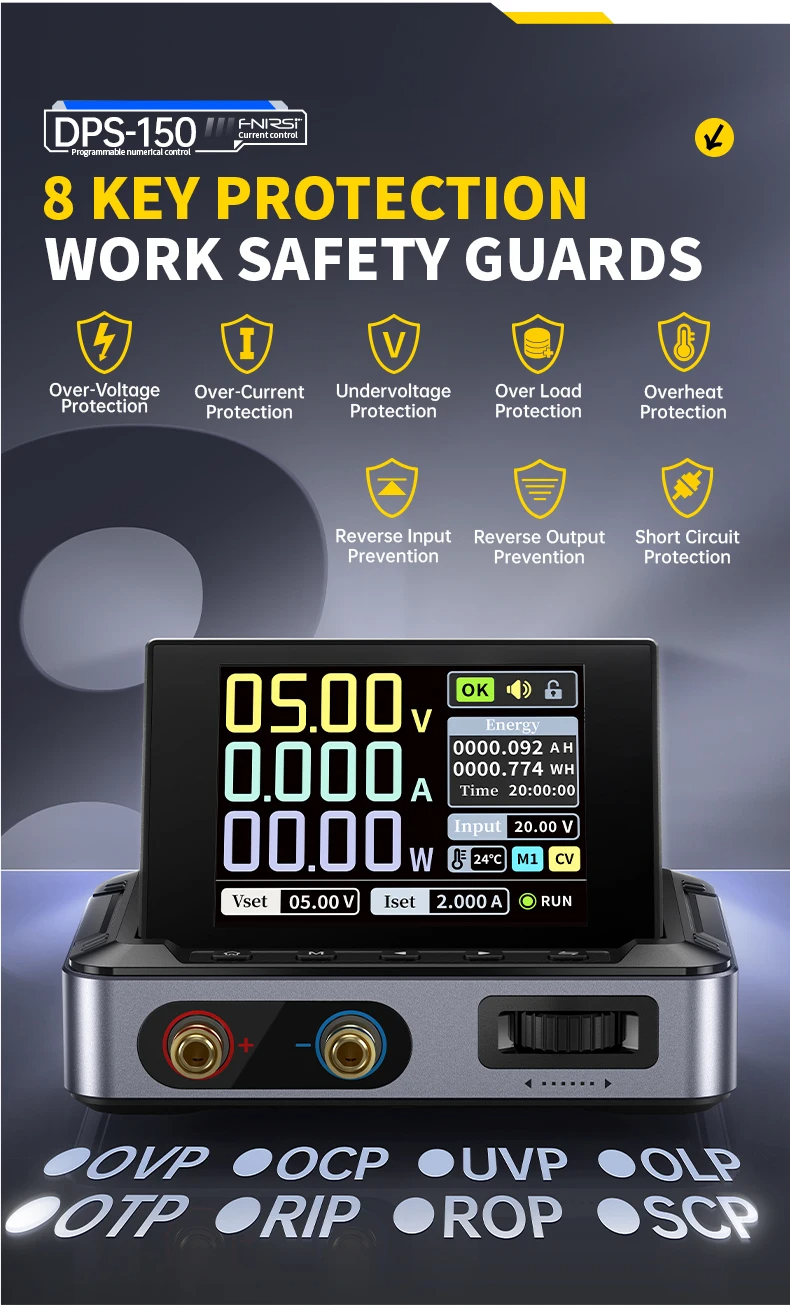 Comprehensive Protections: Includes overvoltage, overcurrent, overpower, and short circuit protections for enhanced safety.