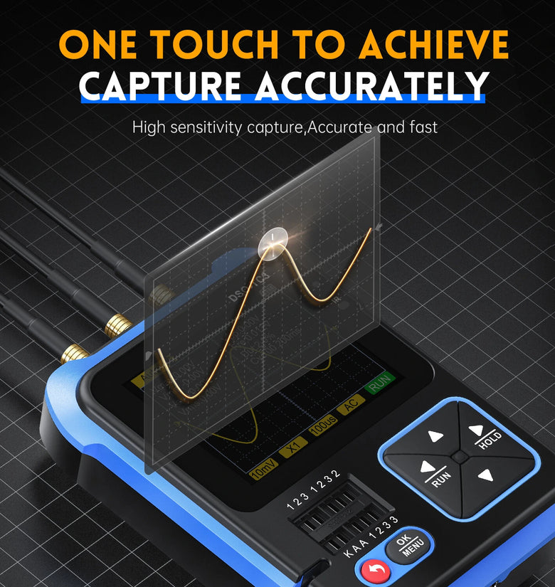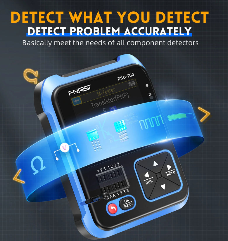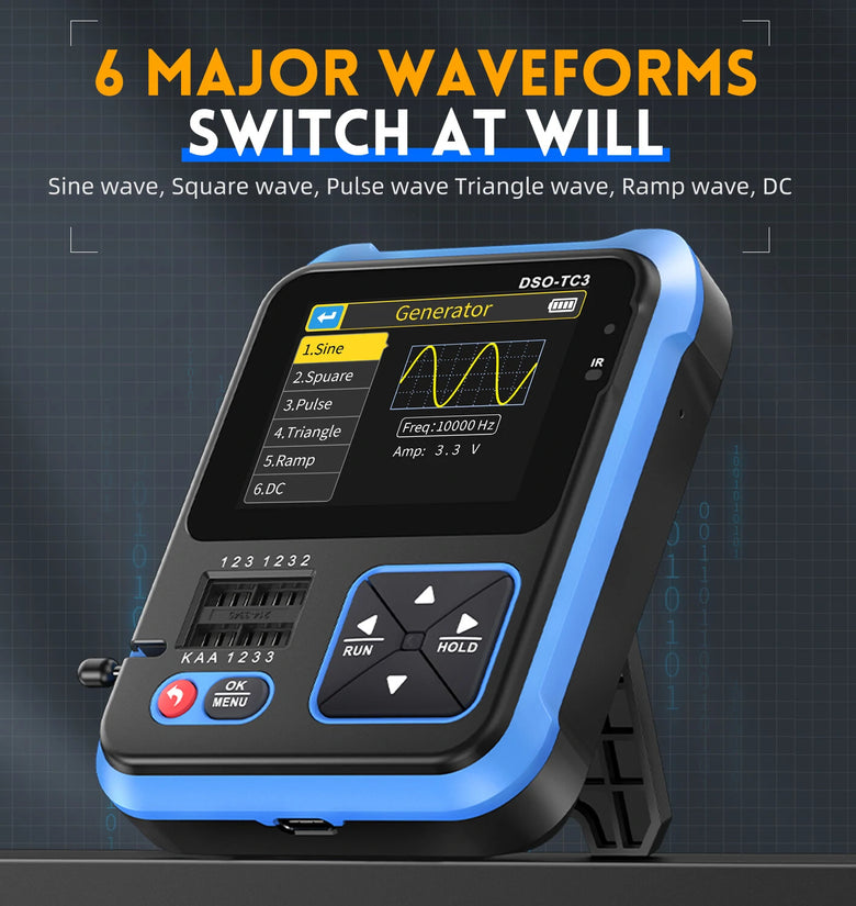 ● Digital Oscilloscope Function: With the real-time sampling rate of 10MS/s and bandwidth of 500Khz. Support maximum measurement of 400V voltage signal. With complete trigger function (automatic, single, regular). Equipped with an efficient button AUTO. ● Transistor Tester Function: Automatically identify and measure various transistors, including NPN and PNP triode, N-channel and P-channel metal oxide-semiconductor field effect transistor, JFET, diodes, double diodes, thyristors,as well as resistors, inductors, capacitors, field-effect transistor, etc. passive component. Auto-detect pin definitions. ● Signal Generator Function: 6 kinds of signal waveforms: sinewave, pulsewave, trianglewave, rampwave, direct current. 1-100KHz adjustable output frequency. 3.3V adjustable output voltage. 0-100% adjustable output duty ratio. ● Tool Box Function: Automatically analyze specific Protocol infrared code. Other function modes: including circuit continuity test, 0-40V input voltage measurement, PWM output, 0-32V diode measurement, temperature and humidity sensors measurement, etc. ● 2.4inch Digital TFT Display: TFT color screen, high resolution display with LED backlight, with bright colors and high contrast. ● High Accuracy: Infrared decoding design, quick response, accurate capture of highly sensitive response signal, fast and accurate measurement with small error. ● Rich and Powerful Features: One button for automatic adjustment, support for free switch, support intelligent fire preventions. ●Long Endurance: Built-in 1500mAh high-capacity rechargeable polymer lithium battery, long lasting lifespan, Type-C interface, continuous power supplys without isolation transformer, safer to use. ● Folding Bracket: Comes with invisible bracket, integrated folding, stable placement, free your hands, does not occupy too much space. ●Wide Applications: Suitable for mcu debugging, car repairing, home appliance repairing, DIY electronic competition, power-supply debugging, inverter, etc. | |