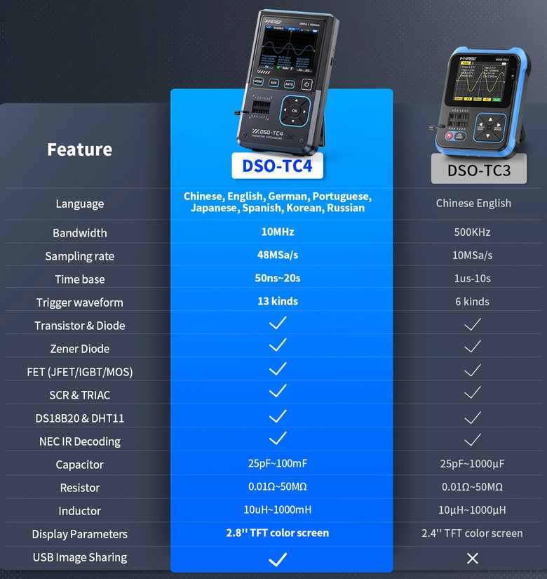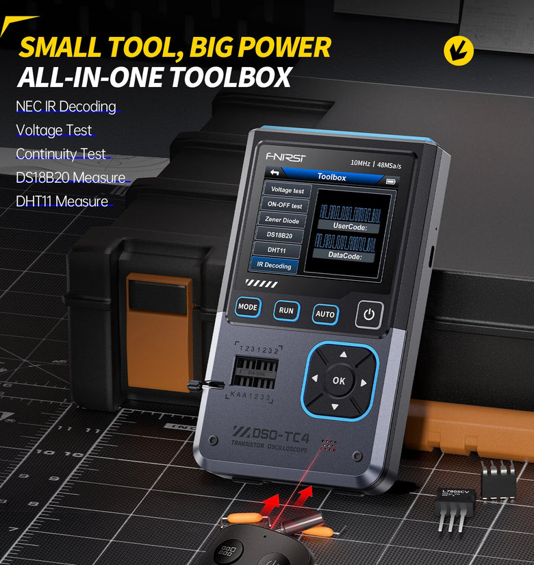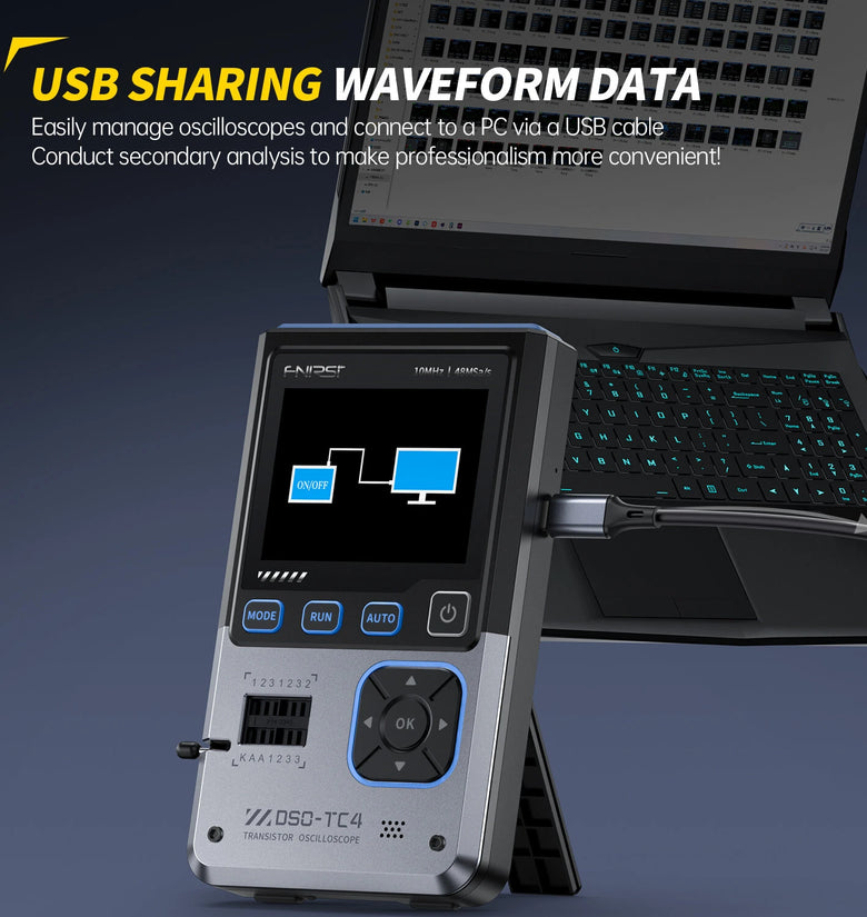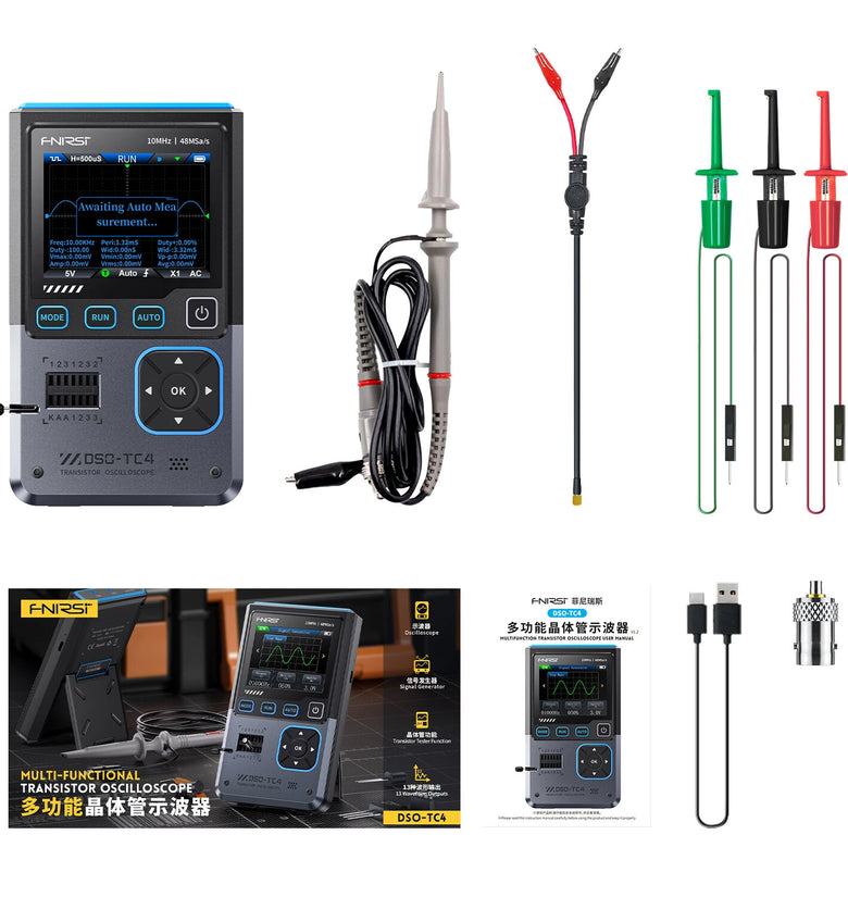 • FNIRSI DSO-TC4 3-in-1 Oscilloscope Signal Generator Transistor Tester 48MSa/s 10MHz Bandwidth Portable Design Rechargeable Battery Adjustable Waveforms