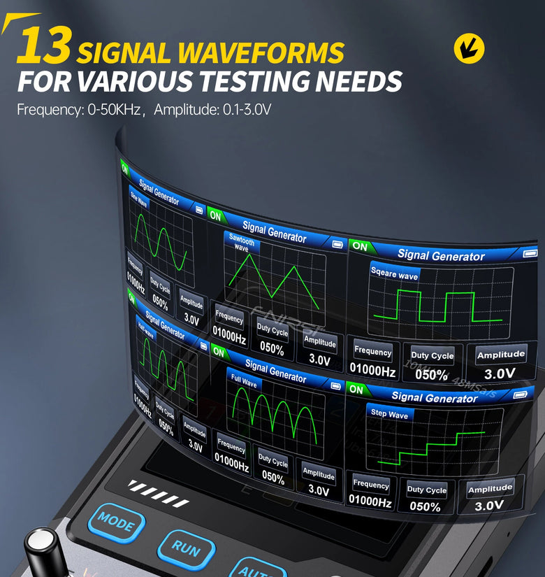 - Provides 13 adjustable waveform outputs with a frequency range of 0 – 50KHz. Users can easily adjust output parameters, including frequency, amplitude, and duty cycle, to suit various applications.