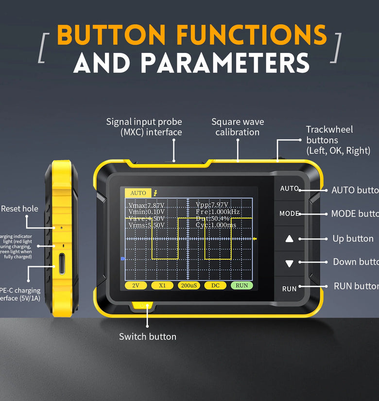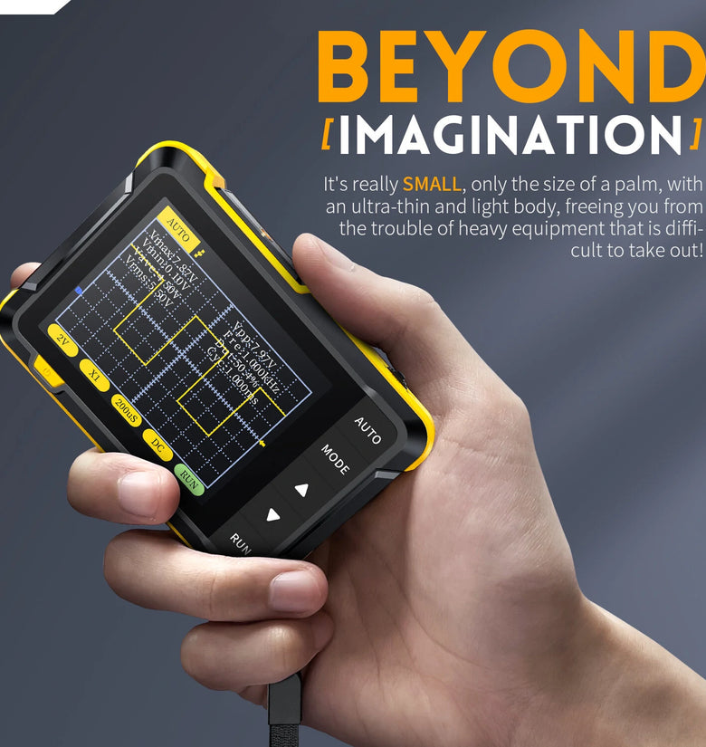 This digital oscilloscope is compact in size, with 2.8inch color display, with the real-time sampling rate of 2.5MS/s, 200kHz bandwidth, with complete trigger functions (single, normal, automatic), both for periodic analog signals or non-periodic digital signals can be freely used, support switching between rising-edge trigger mode and falling-edge trigger mode, support up to ±400V voltage signal measurement. With waveform measurement display, a variety of waveform measurements to meet your daily needs. With a 1KHz calibration SQW, one-button automatic adjustment, and with Type-C port supports firmware upgrade and charging. Suitable for utility measurements, DIY learning, automobile repairing, home appliance repairing, research and teaching, outdoor maintenance, etc.