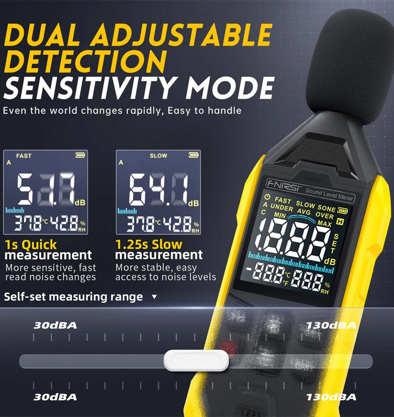 Versatile Dynamic Characteristics: Whether capturing sudden sharp noises or monitoring prolonged ambient sounds, the FAST (fast) and SLOW (slow) response speeds make this meter incredibly versatile. Additionally, the device provides clear overload indications with 'OVER' and 'UNDER' symbols, making it foolproof.
