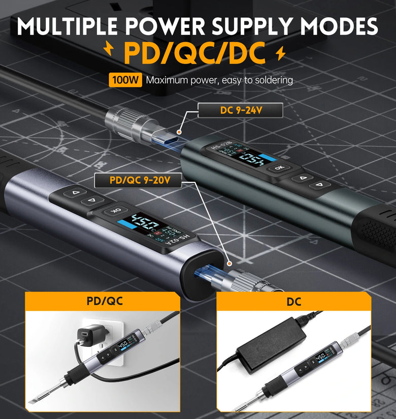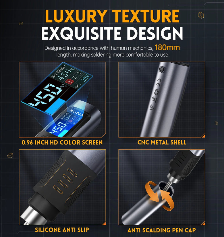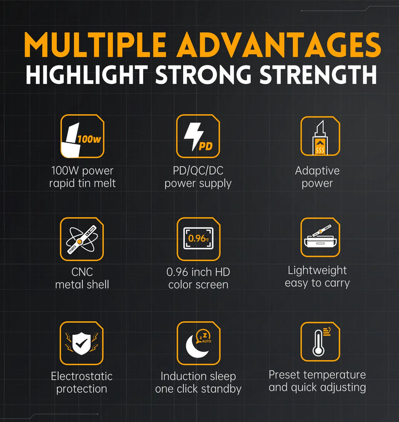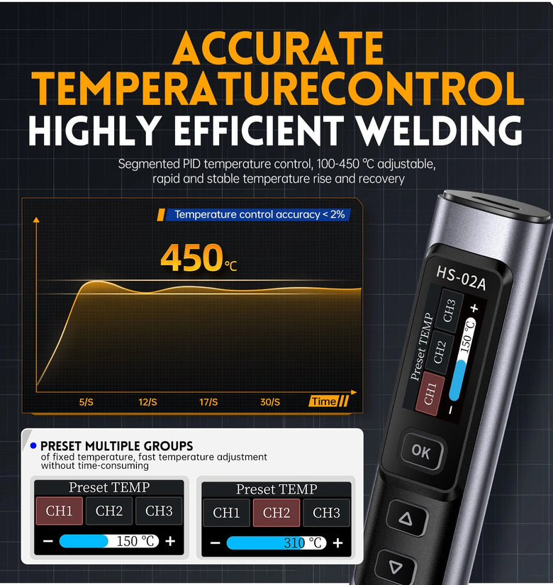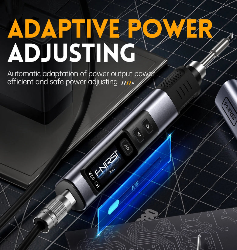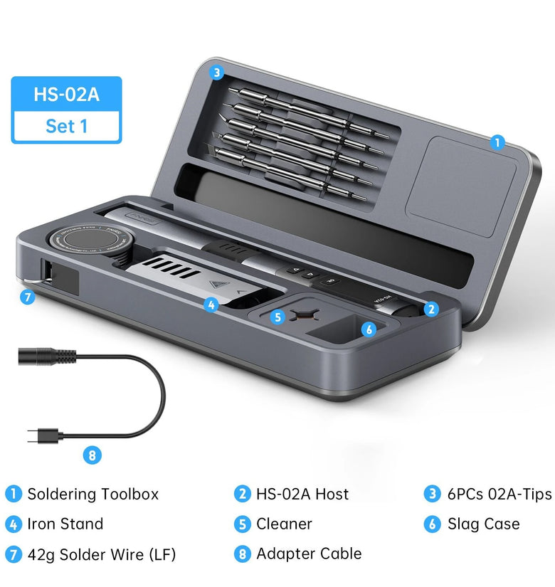 [High-Power & Fast Charging] The HS-02 Smart Soldering Iron provides a robust 100W power supply, and supports PD/QC protocol for quick and efficient charging.[Wide Temperature Range] With a temperature range of 100-450℃ (180-842°F), it caters to diverse soldering needs.[Advanced Display] The device features a 0.96” IPS HD color screen for detailed and easy-to-understand performance monitoring.[Energy Efficient] It boasts an adaptive power adjusting feature, which ensures efficient and safe power output.[Convenience & Durability] Designed with a CNC metal shell, this device offers durability and a handy one-click standby mode.Specifications:Brand: FNIRSIWorking Voltage: 9-20VTemperature Range: 100-450℃(180-842°F)Screen: 0.96 IPS HD color screenWeight: 61gPower Supply: Type-CFast Charging Protocol: PD/QCPower: 100W(max)Soldering Iron Tip: HS-02A-KU HS-02B-KBody Material: CNC Aluminium Alloy + SiliconePackage Included:HS-02A with 6 Tips:1 x HS-02 Smart Soldering Iron1 x Type-C Power Cable1 x KU Soldering Iron Tip1 x K Soldering Iron Tip1 x JS Soldering Iron Tip1 x I Soldering Iron Tip1 x C2 Soldering Iron Tip1 x B Soldering Iron Tip1 x User Manual
