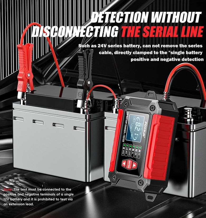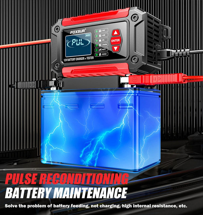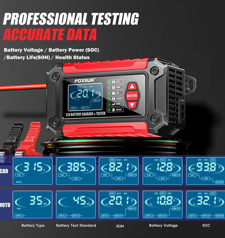 • FOXUR FTC-1206 Car Battery Charger Tester with Comprehensive Health Check Precise Test Range 4AH-200AH Pulse Repair Function User-Friendly LCD Screen Safe AC to DC Charging Protection