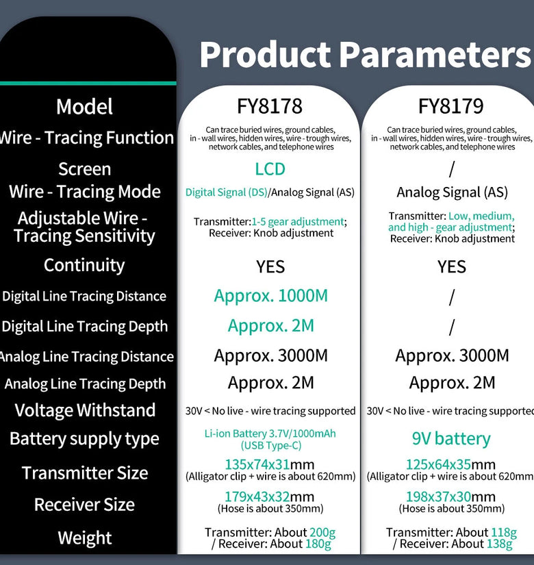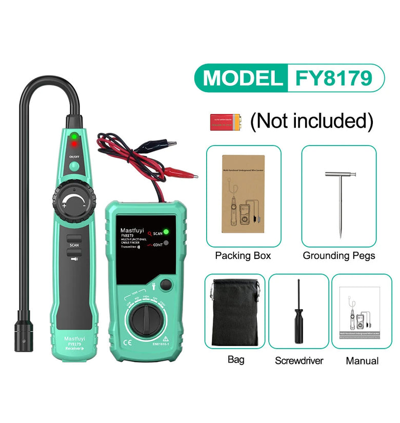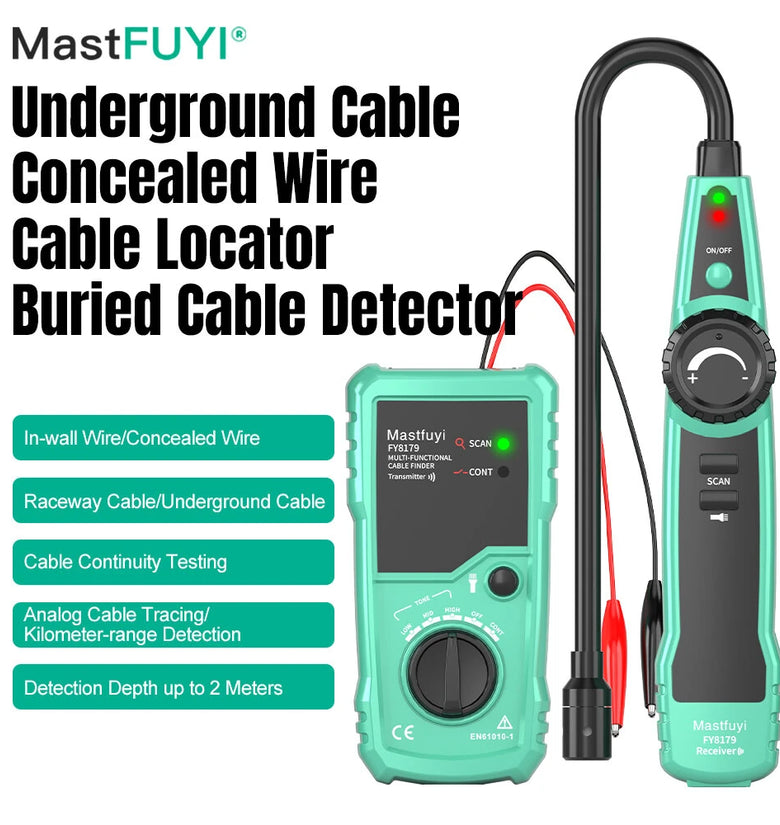 • Fuyi FY8179 Underground Wire Cable Locator Analog Signal Adjustable Sensitivity 3000M Range 2M Depth Continuity Testing 9V Battery Powered Lightweight Tool