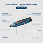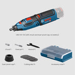 Hightlights:GRO 12V-35 is a multifunctional tool suitable for cutting, grinding, milling, sanding, polishing, and drilling applications, and can work freely on limited surfaces. Its design structure is compact, balanced, and highly ergonomic, with replaceable covers to ensure high-quality and precise operation.Function:1. LED lighting, convenient for working in dark spaces2. Multi functional: cutting, polishing, polishing, drilling3. 6-speed adjustment: 5000-35000rpmFeatures:1. Two dust covers to be replaced according to work requirements2. Ergonomic handle, wrapped in soft rubber, non slip, and good hand feelParameters:Spindle diameter: 3.2mmBattery voltage: 12VProduct size: φ 55x250mmPackage included:1 * GRO 12V-35 Cordless Rotary Tool(Battery not included)1 * Chuck1 * Fiexed Pin1 * Wrench1 * Dustproof Cap5 * Cutting Disc1 * Accessory Case
