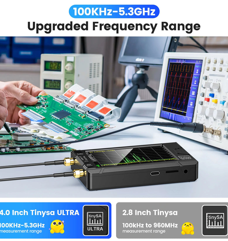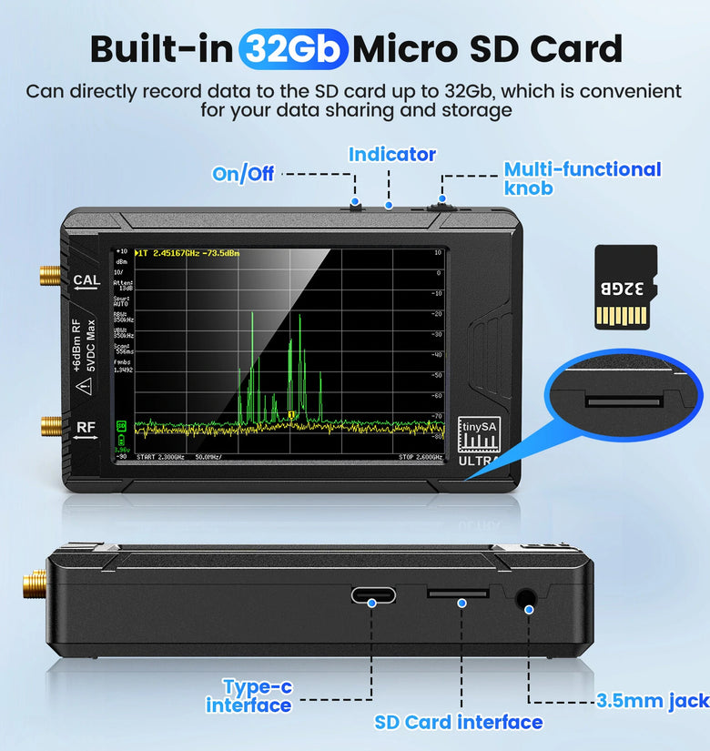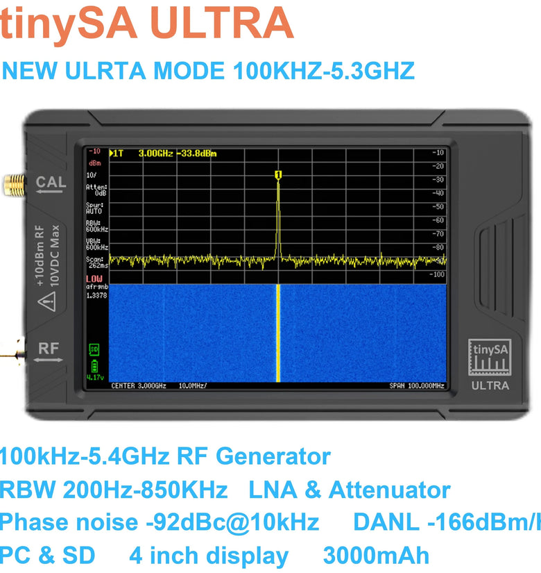 - Spectrum Analyzer for 0.1-800MHz or, with Ultra mode enabled, 0.1MHz-6GHz