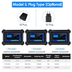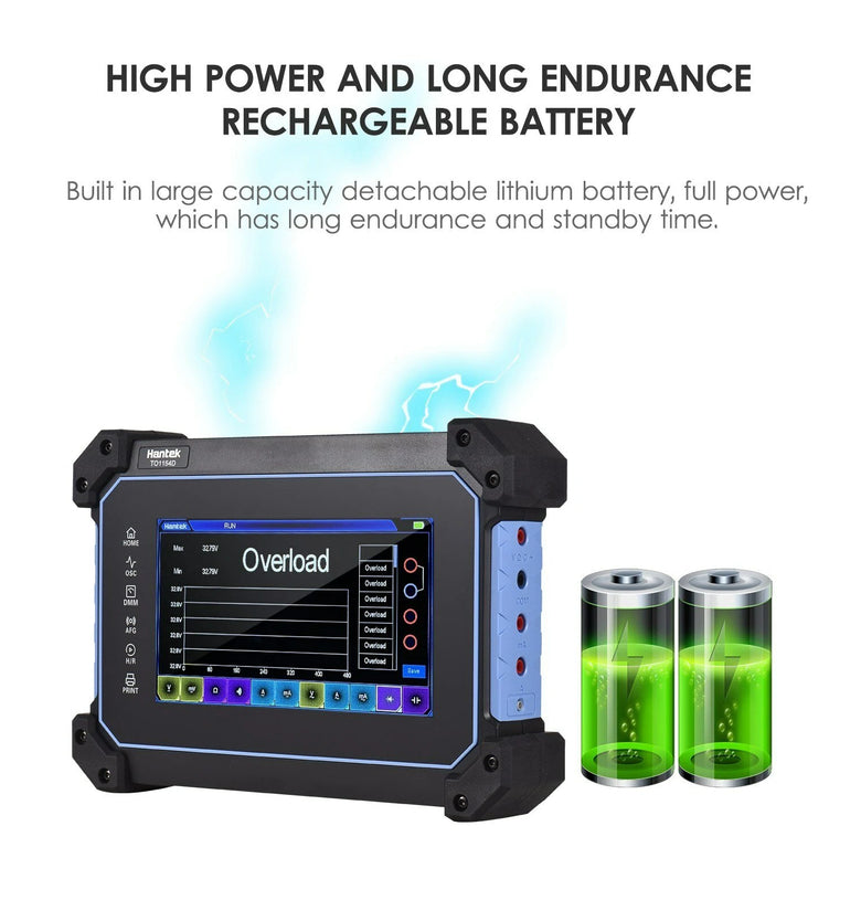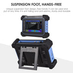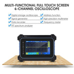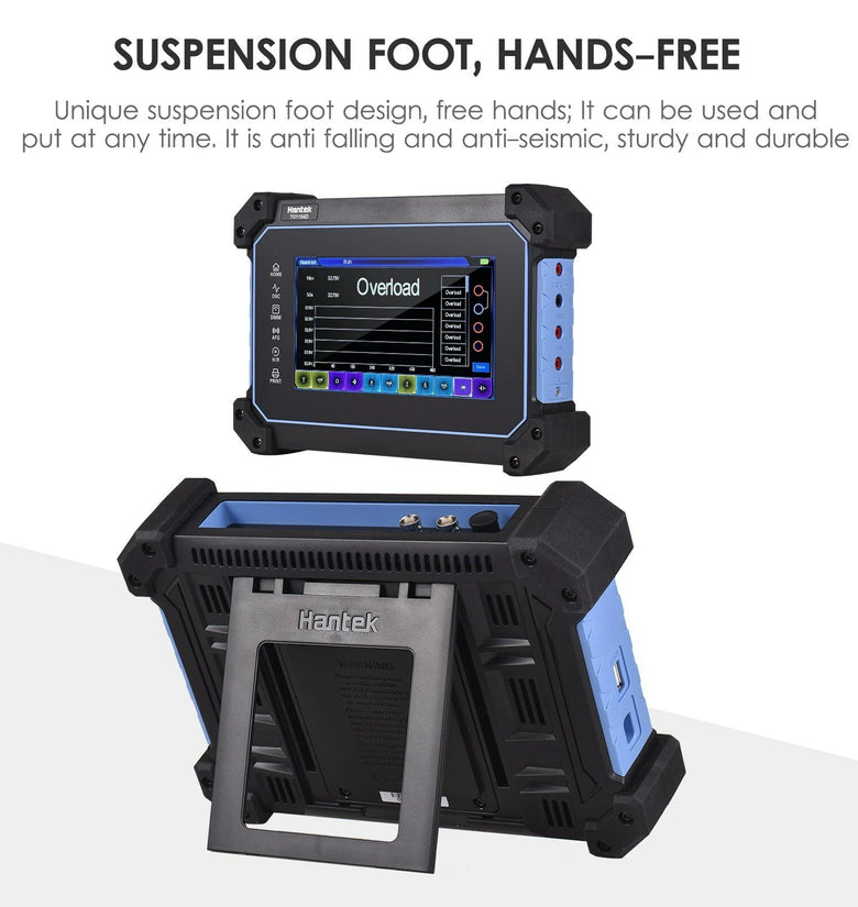 The multi-functional full touch screen oscilloscope has a thin body, light weight and is easy to carry. Unique hanging design, hands-free, anti falling and anti-seismic, sturdy and durable; It integrates oscilloscope, multimeter, signal generator and spectrum analyzer; Built in super large capacity battery, long endurance, support fast charging, and abundant power.