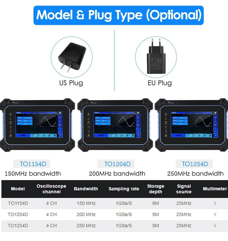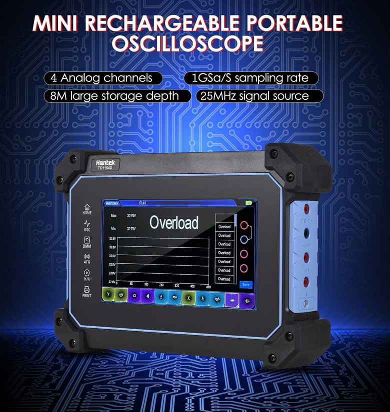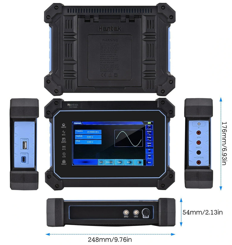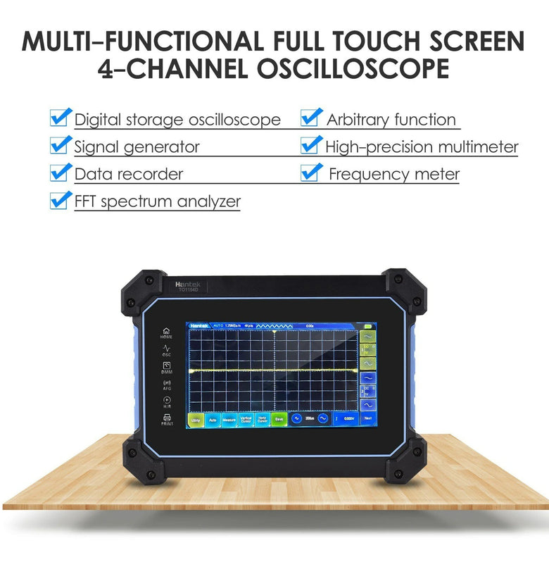 • Hantek TO1154D Rechargeable Portable Oscilloscope Multimeter 4-Channel 150MHz Bandwidth 1GSa/S Sampling Rate 8M Storage Depth 25MHz Signal Source 7-inch TFT LCD Digital Storage Oscilloscope Arbitrary Waveform Generator with Tool Bag