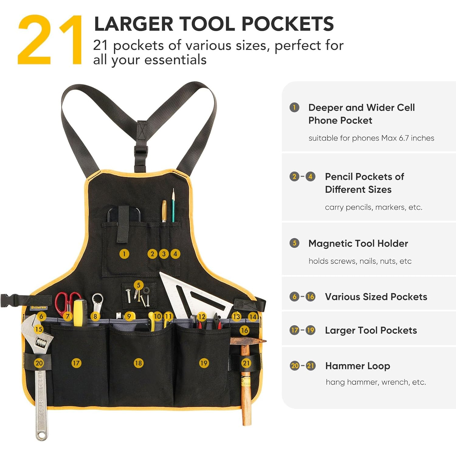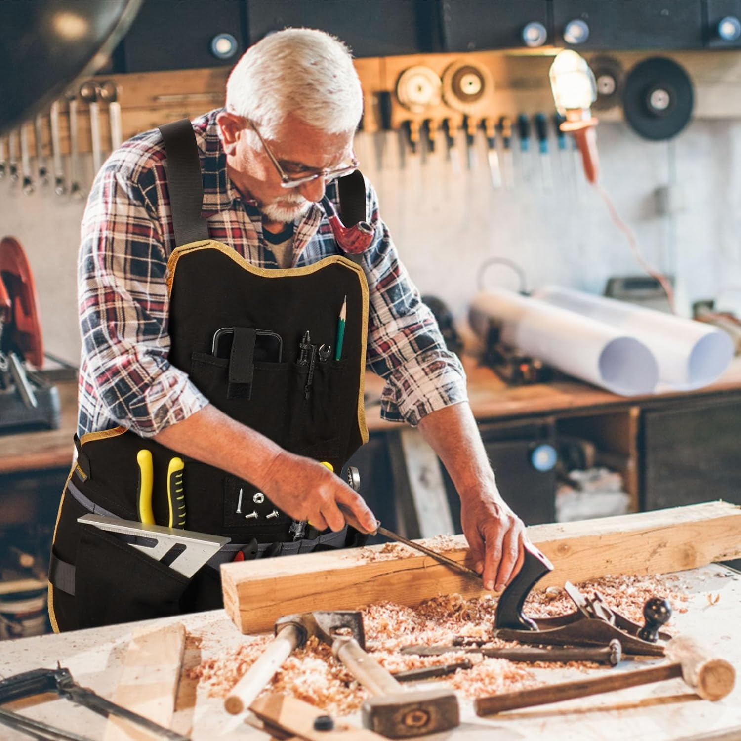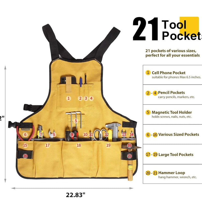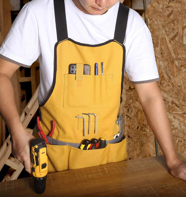 1.Ample Storage with 21 Pockets: This work apron includes 21 well-organized pockets in various sizes to fit your essential tools, such as screwdrivers, pliers, scissors—even crafting supplies. A practical companion for woodworkers, mechanics, and DIY enthusiasts.