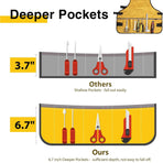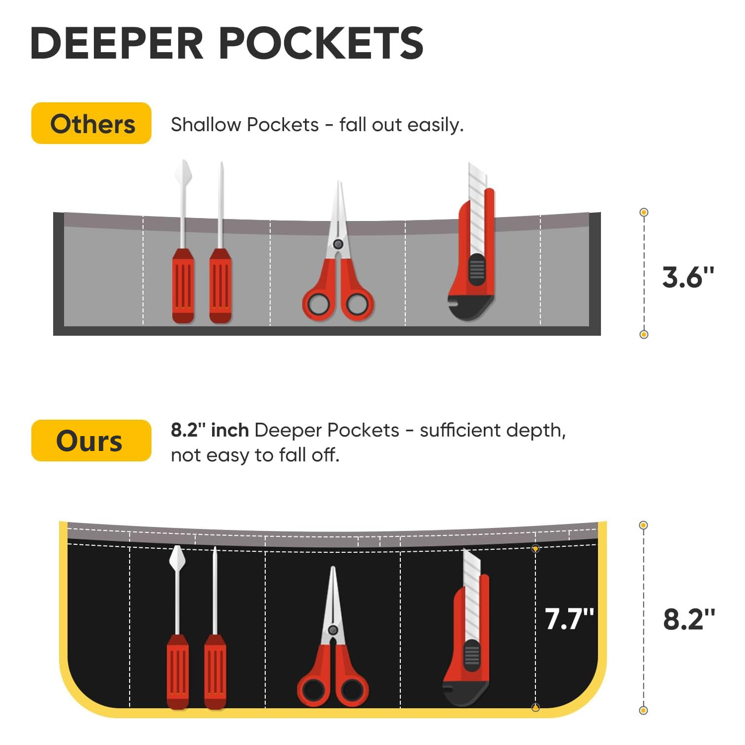3.Deepened Pockets with Extra Security: The cell phone pocket utilizes an elastic strap to prevent items from slipping out, while the large pocket design—6.7 inches deep—makes it ideal for storing larger tools and keeping them in place whenever you lean forward.