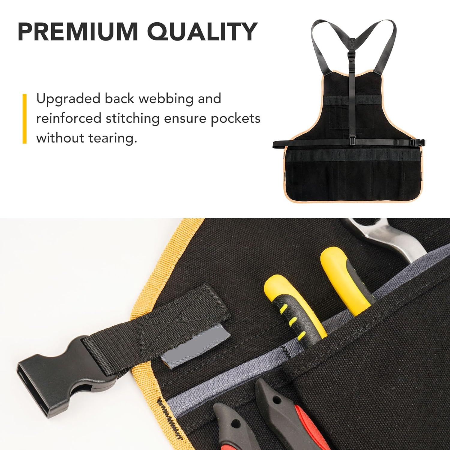 4.Sturdy and Reinforced Build: Made with professional-grade 16 oz canvas and reinforced webbing, the tool apron offers reliable performance to protect against wear and tear during heavy-duty use.
