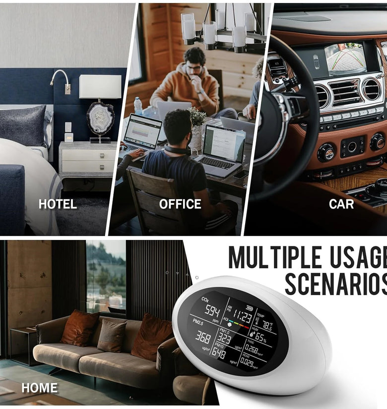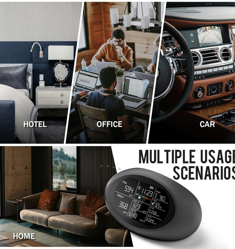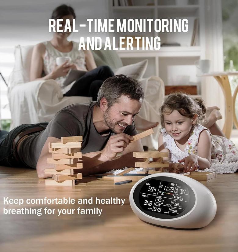 1. Comprehensive Monitoring: The 12-in-1 Air Quality Monitor provides real-time data on CO2, TVOC, PM1.0, PM2.5, PM10, humidity, temperature, and time, helping users maintain optimal indoor air quality.