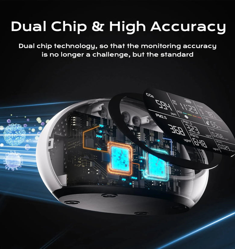 2. Dual Chip Technology: Features an upgraded 5.0 dual chip, with one chip dedicated to sensor data processing and the other to manage the user interface, ensuring faster, more accurate air quality readings.