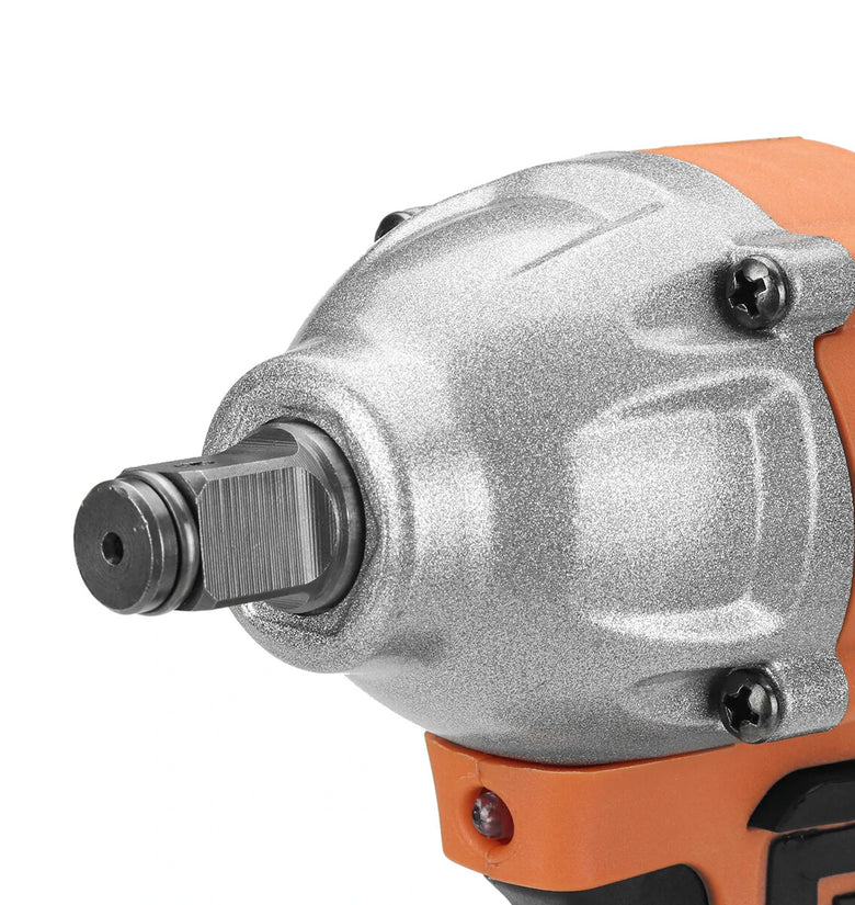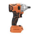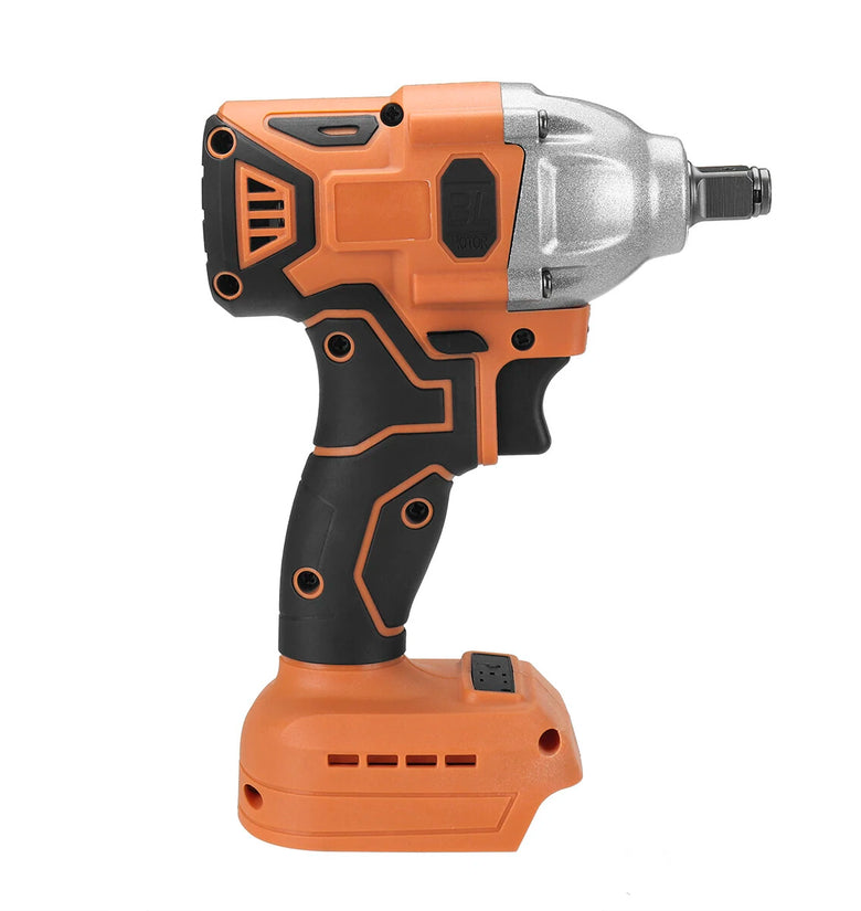 Powerful Torque: With a maximum torque of 380NM, this impact wrench is perfect for high-demand tasks, easily doing and undoing car wheels and other heavy-duty fastening applications.High-Speed Performance: Enjoy efficient work with the wrench's impressive no-load speed of 06200 RPM and impact rate of 06200 per minute, designed to save you time and effort.Sturdy and Durable: The tungsten steel shaft ensures high hardness and wear resistance, offering a reliable tool that withstands heavy use and lasts longer.User-Friendly Features: The wrench includes a stepless speed change switch and a reverse rotation auto-stop mode that halts impact and rotation within 0.2 seconds after a bolt/nut is sufficiently loosened, enhancing usability and safety.Wide Application: Whether for construction site shelves, maintenance, woodworking, or fabrication trades, this wrench provides versatile fastening controls to suit various needs.Specifications:Color: OrangeMotor: BrushlessSquare Drive: 1/2'Max. Torque: 380 N.MNo-load Speed: 0~6200 RPMImpact Rate: 0~6200 Per MinutePackage Includes:1 x Electric Brushless Impact Wrench (Battery Not Included)1 x User Manual