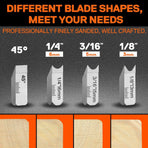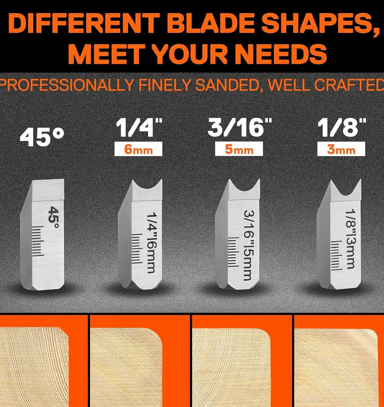 The package includes four different shaped cutter heads, offering versatility to meet various woodworking requirements. The 45° flat cutter head and three round cutter heads (1/4', 1/8', and 3/16') provide comprehensive methods for edge trimming and corner flattening tasks.