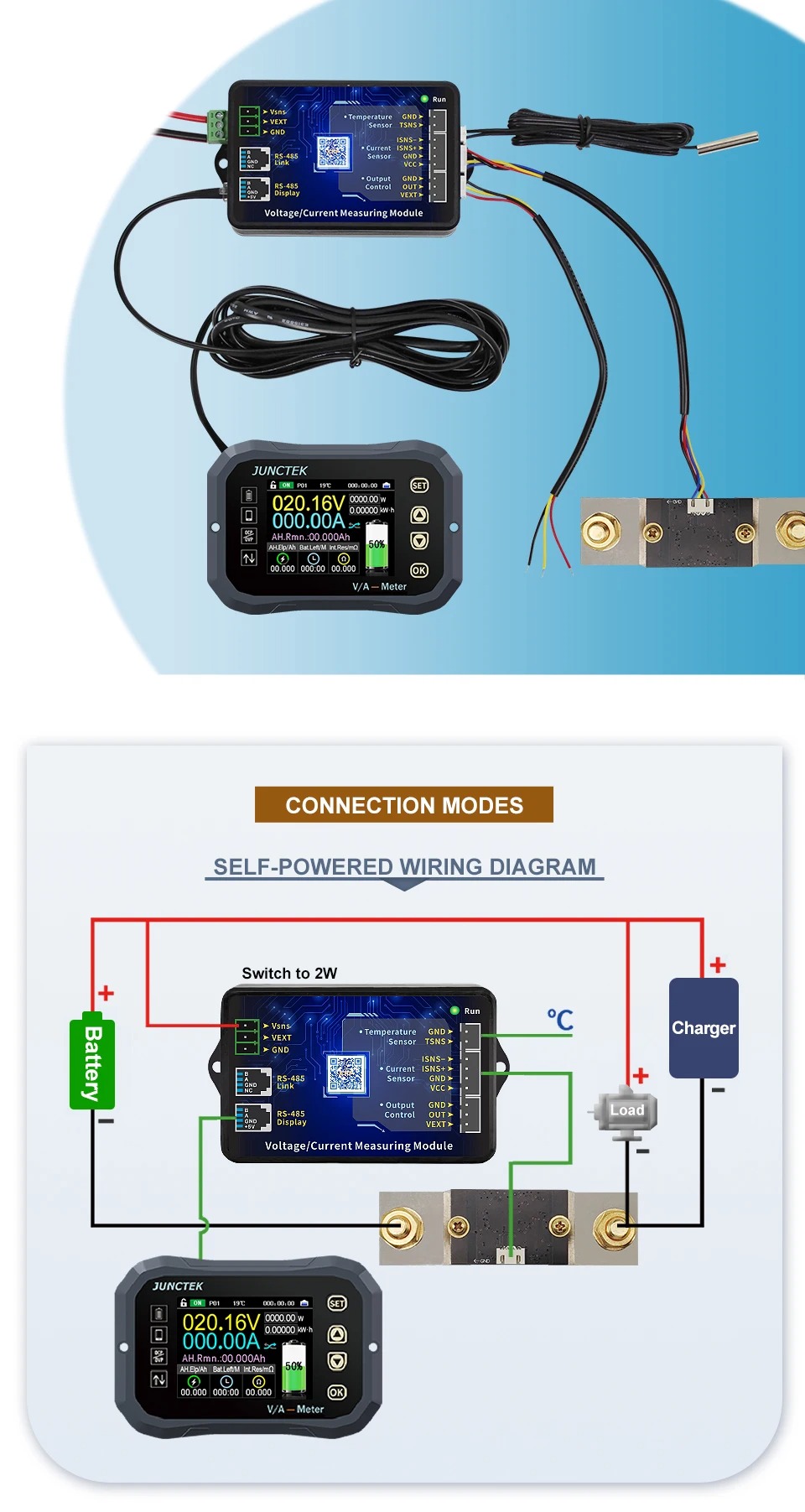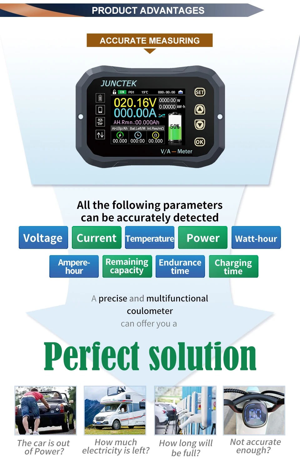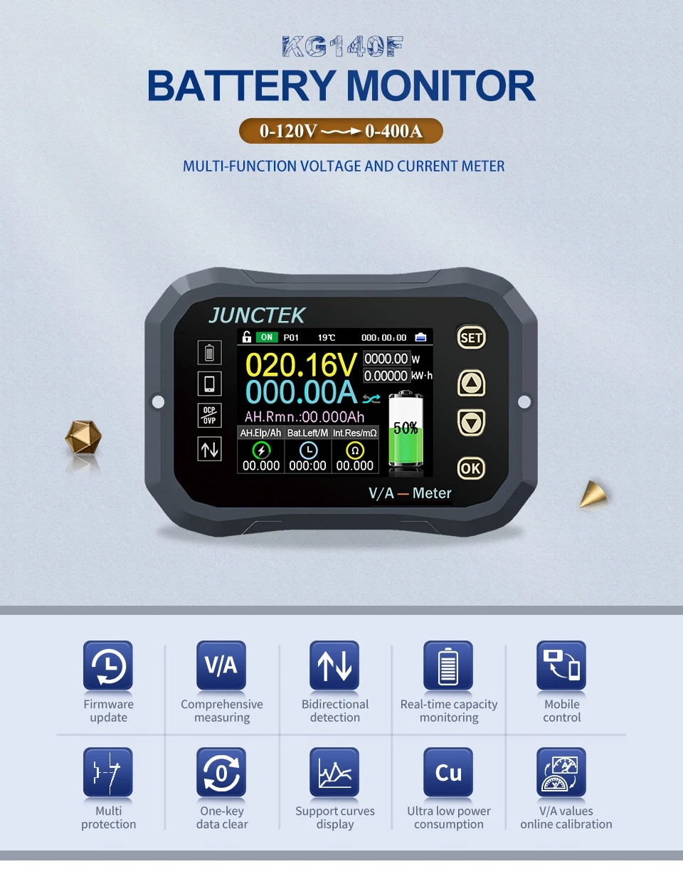 The KG-F Series color screen wireless bluetooth battery coulomb counter is a professional instrument for monitoring the remaining battery capacity. At the same time, it can monitor the battery voltage, current, power, ambient temperature, electrical energy, the time required for full charge and the amount of energy during charging and discharging. A series of parameters such as how long it takes to support 0-100A /0-400A/0-600A current, and can be used for batteries with a voltage of 0-120V in a fully charged state.