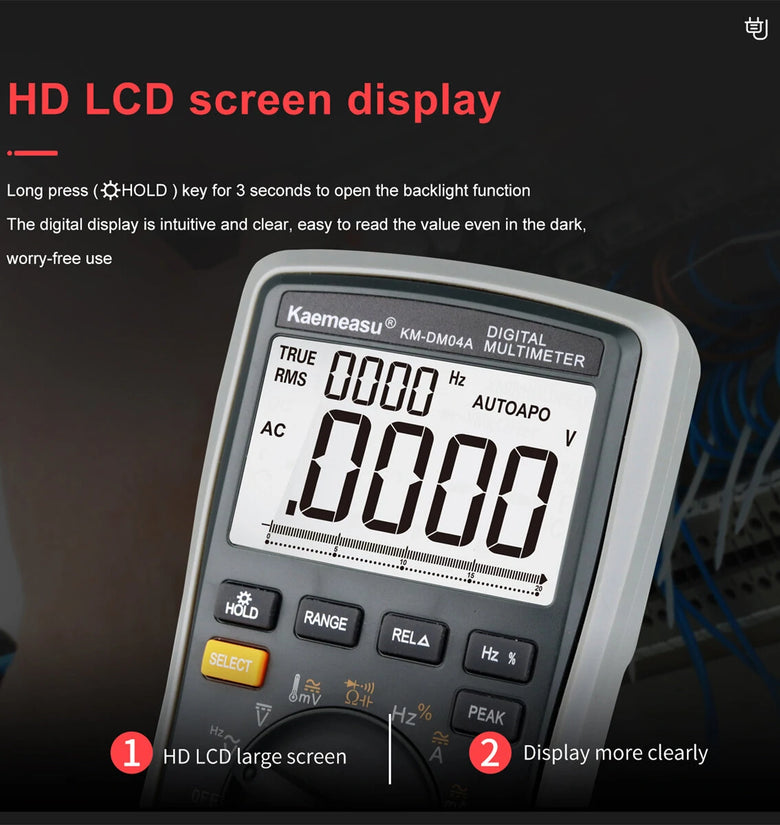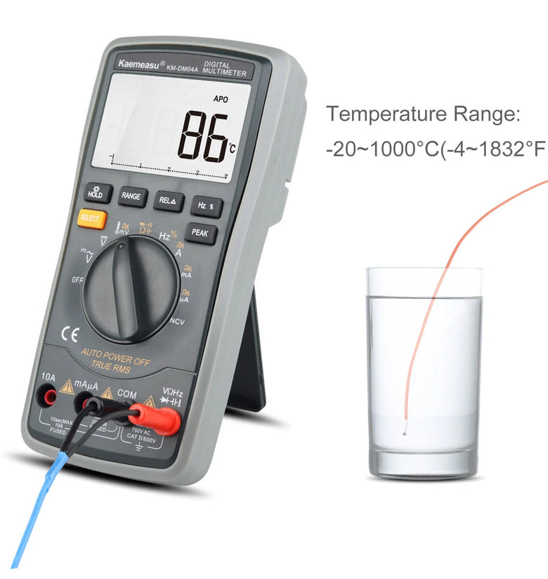 Features:Introducing the Kaemeasu KM-DM04A, a high-quality digital multimeter engineered for precise, reliable measurements. This tool is perfect for both beginners and seasoned professionals who need aversatile instrument in their kit. Auto Range: Say goodbye to manual adjustments, as this feature automatically selects the appropriate operating range for your measurements.True RMS: Guarantees accurate and consistent readings, regardless of waveforms. Diode Test: Quickly and easily test diodes directly. LCD Backlight: Ensure easy readability even in dim lighting conditions with the crisp LCD backlight. Relative Value Measurement: Compare results easily with this useful feature. Voltage Alarm: Stay safe with theintegrated voltage alarm that alerts you to potentially dangerous voltage levels.Data Hold: Capture readings conveniently without needing to jot them down manually. Peak Hold: Enables you to measure thehighest point of your readings.Analog Bar: A handy feature for visual representation of the measurement. Specifications: Display: 4½ Count Battery Type: 6F22 9V Dimensions: 1849046mm Net Weight: 360gGross Weight: 530gPackage Included:1 x Digital multimeter1 x Test leads1 x English manual1 x Color box1 x Temperature probe