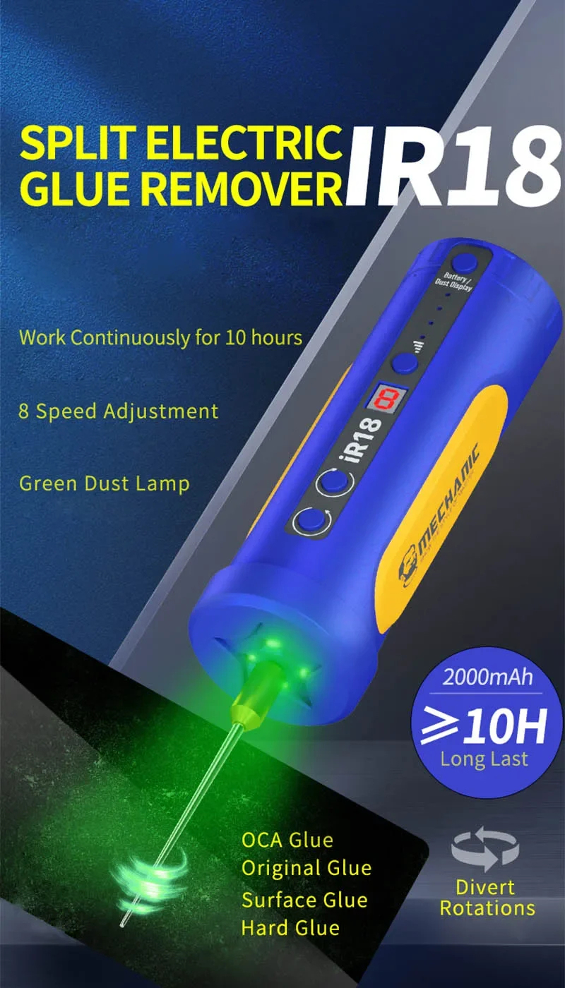 • Mechanic IR18 Electric Glue Remover 2000mAh Battery 8 Adjustable Speeds LED Green Dust Lamp Portable Repair Tool for Mobile Phone and Computer Glue and Dust Removal